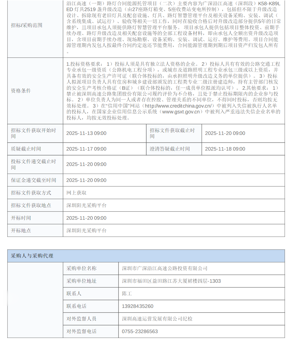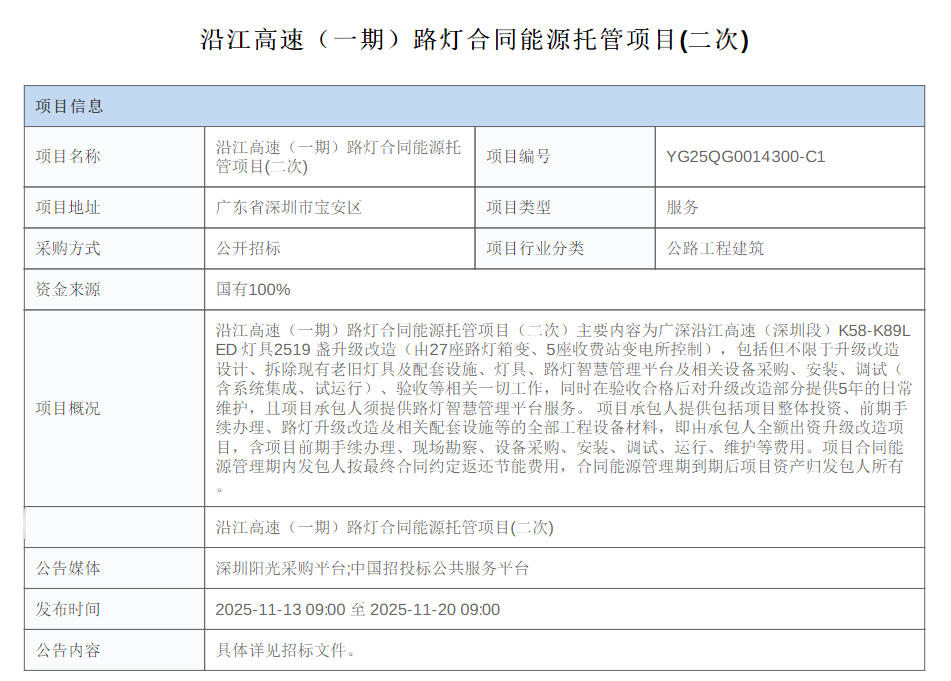 11月13日,广东深圳宝安区沿江高速(一期)路灯合同能源托管项目(二次)招标公告发布。