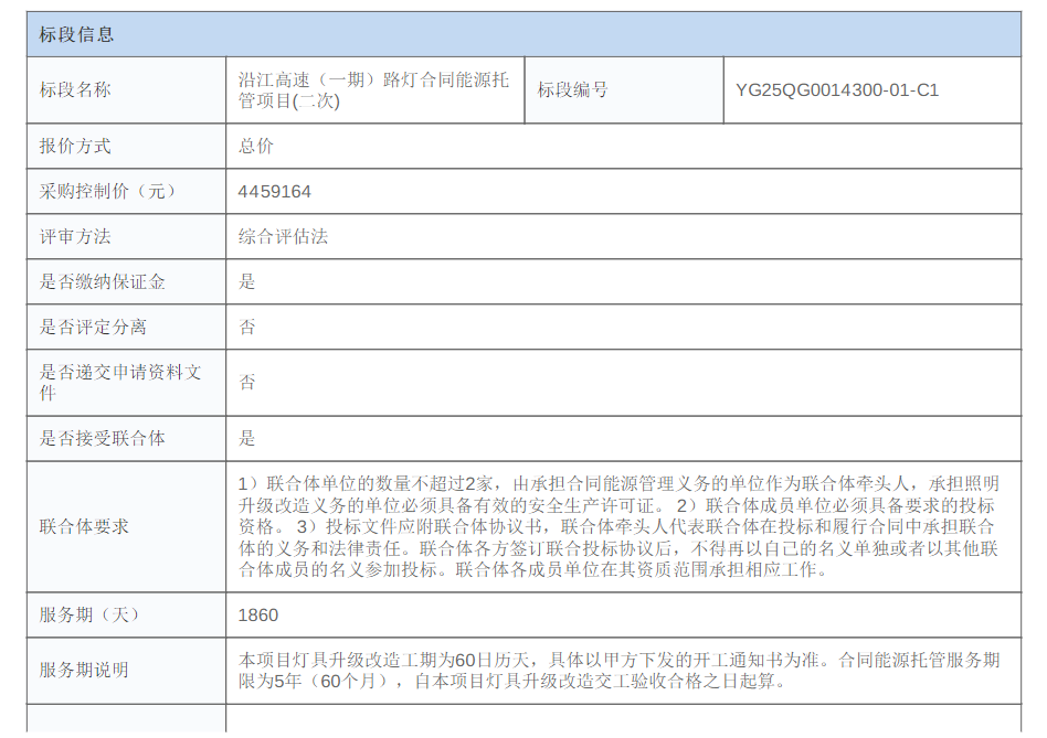 沿江高速(一期)路灯合同能源托管项目(二次)主要内容为广深沿江高速(深圳段)K58-K89LED灯具2519盏升级改造(由27座路灯箱变、5座收费站变电所控制),包括但不限于升级改造设计、拆除现有老旧灯具及配套设施、灯具、路灯智慧管理平台及相关设备采购、安装、调试(含系统集成、试运行)、验收等相关一切工作,同时在验收合格后对升级改造部分提供5年的日常维护,且项目承包人须提供路灯智慧管理平台服务。项目承包人提供包括项目整体投资、前期手续办理、路灯升级改造及相关配套设施等的全部工程设备材料,即由承包人全额出资升级改造项目,含项目前期手续办理、现场勘察、设备采购、安装、调试、运行、维护等费用。项目合同能源管理期内发包人按最终合同约定返还节能费用,合同能源管理期到期后项目资产归发包人所有。