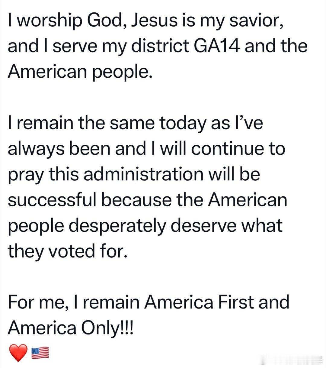 Greene回应“总统取消背书”:T攻击我,是因为Epstein档案…他想杀一儆百,让共和党议员不敢投票…为了阻止公布档案,他不遗余力到这种程度,不可思议…多数美国人希望他为美国人民工作,也能这么拼命…我一直支持他,但我不膜拜他、不为他服务…我膜拜的是上帝、我服务的是佐治亚州选民…我还是原来的我~美国优先!美国唯一!❤️🇺🇸