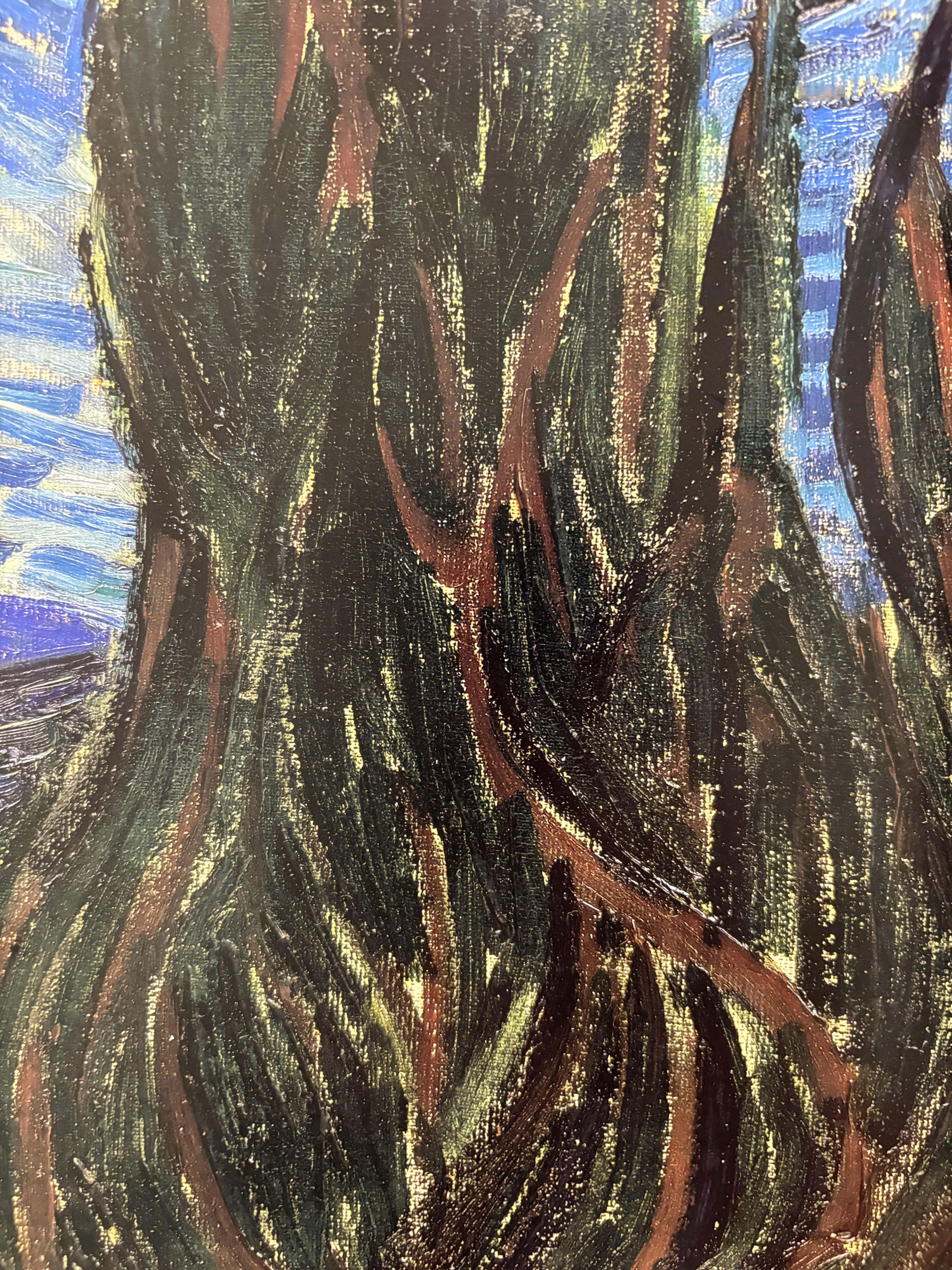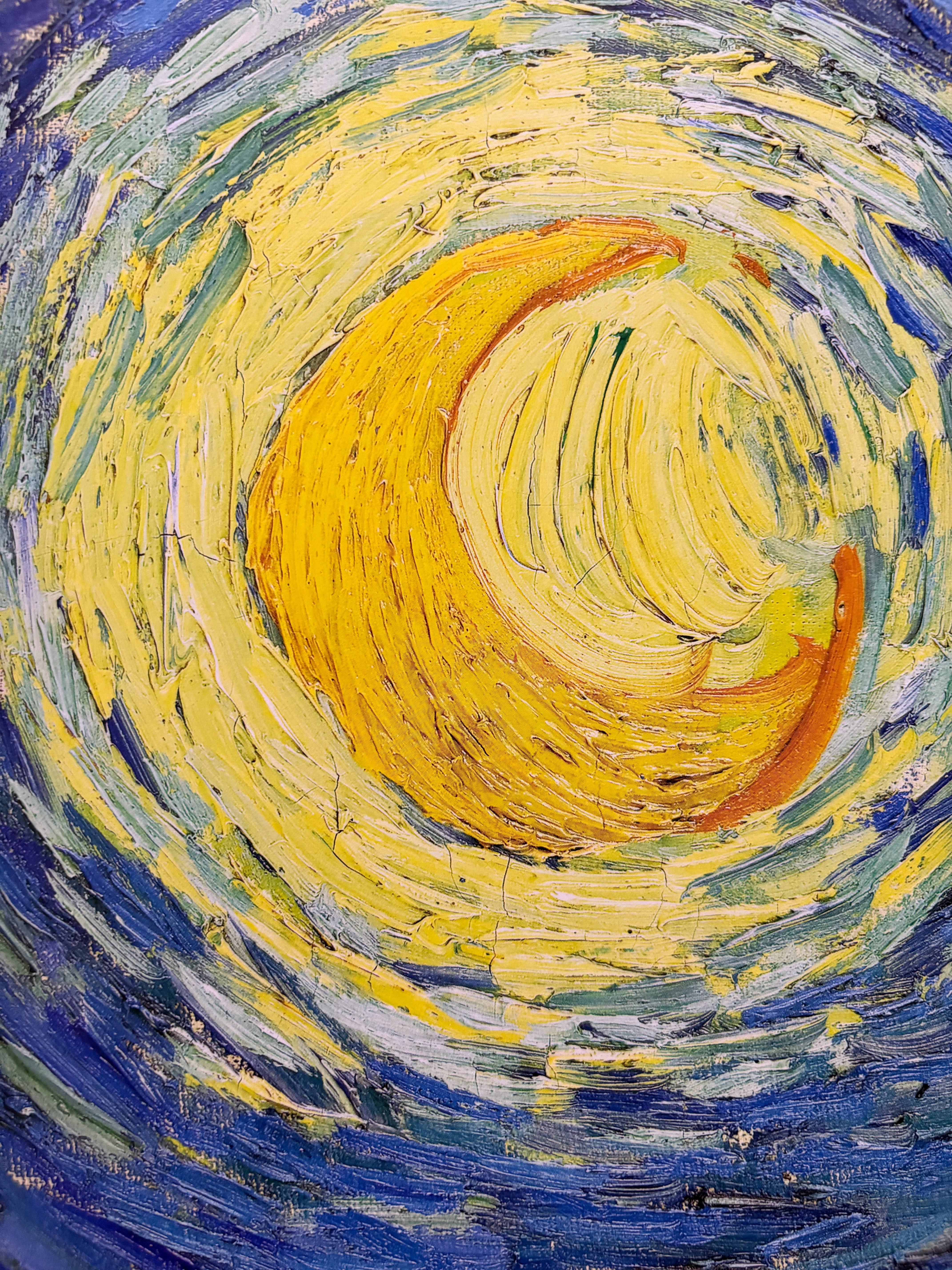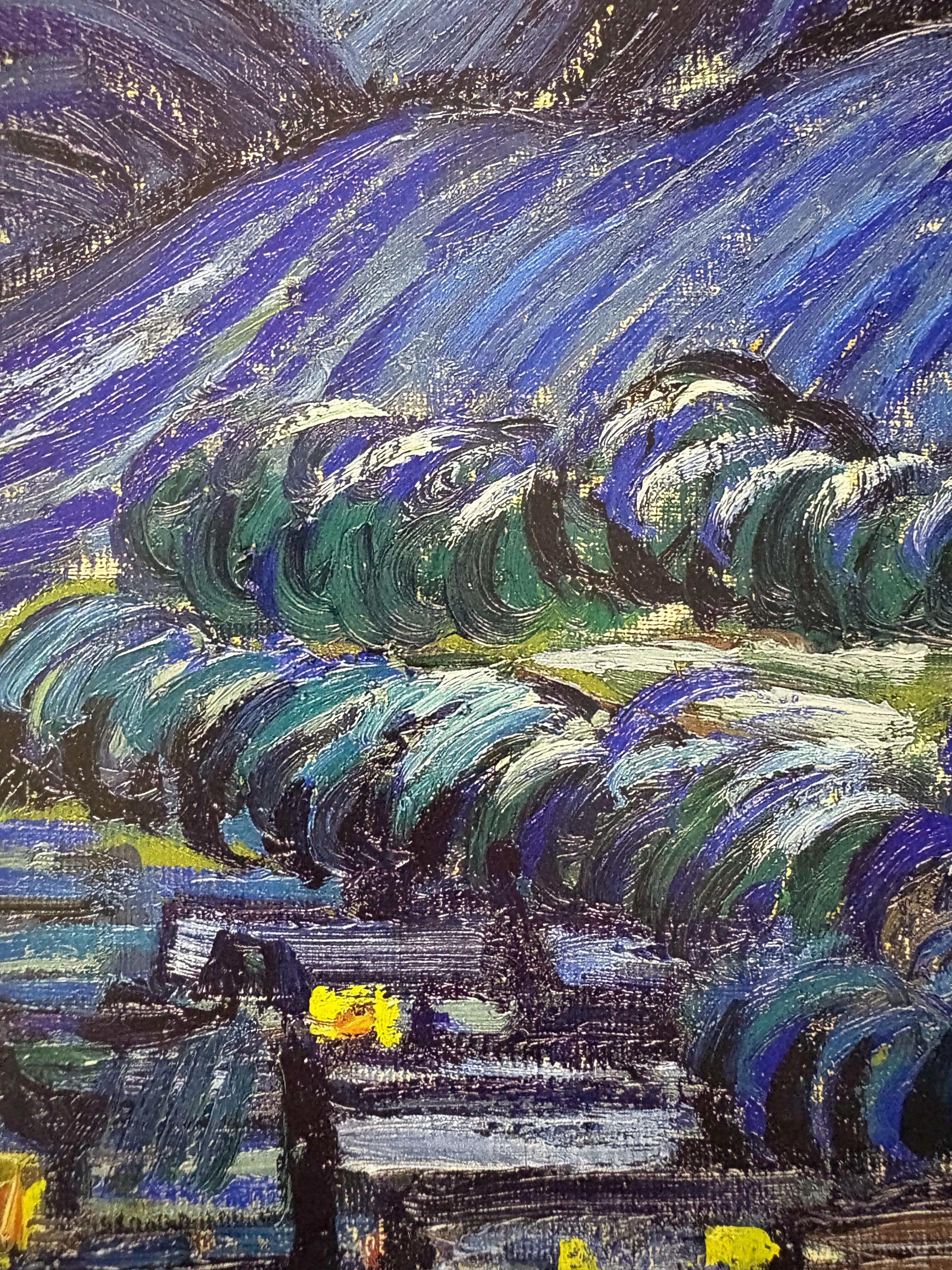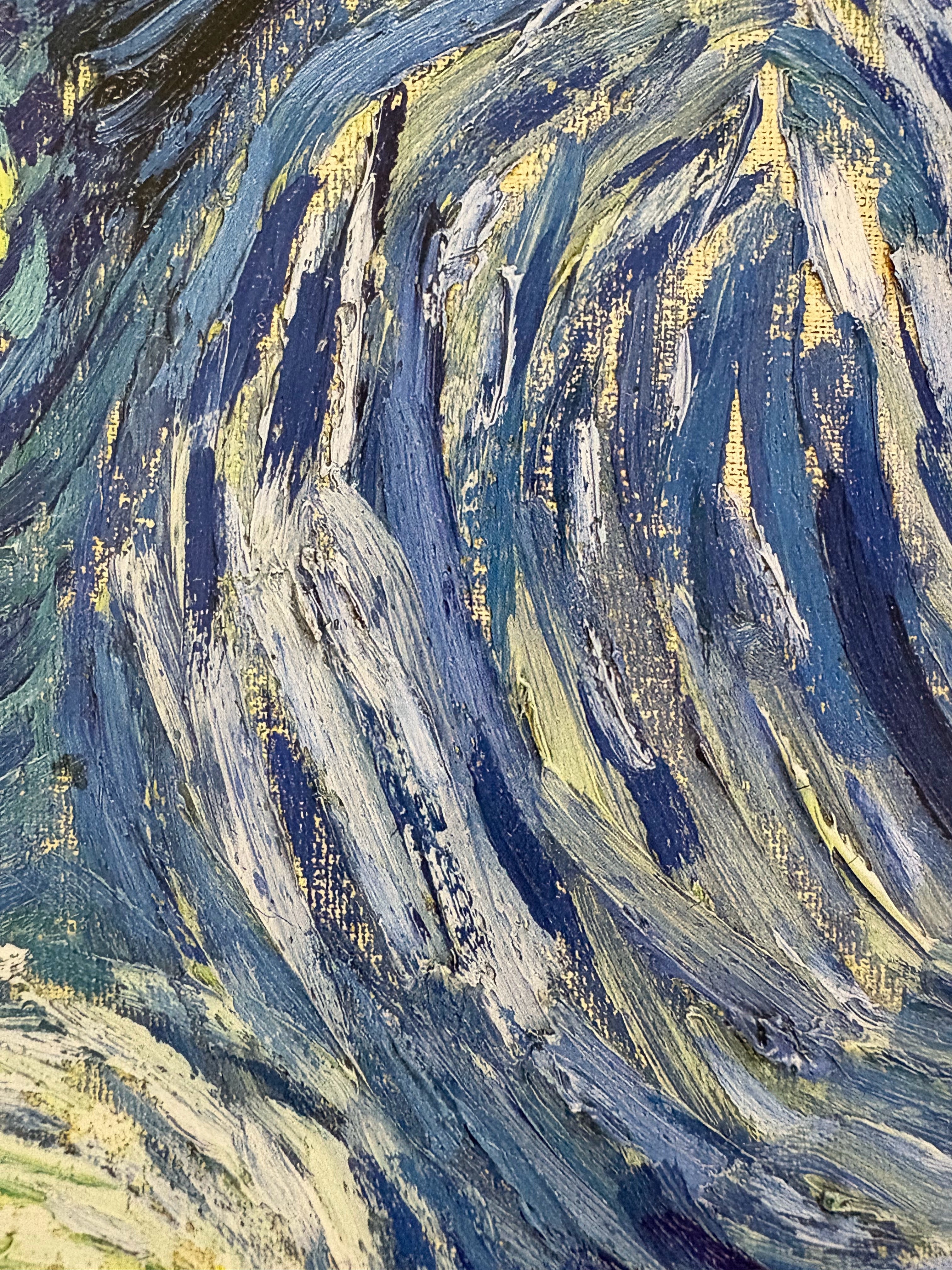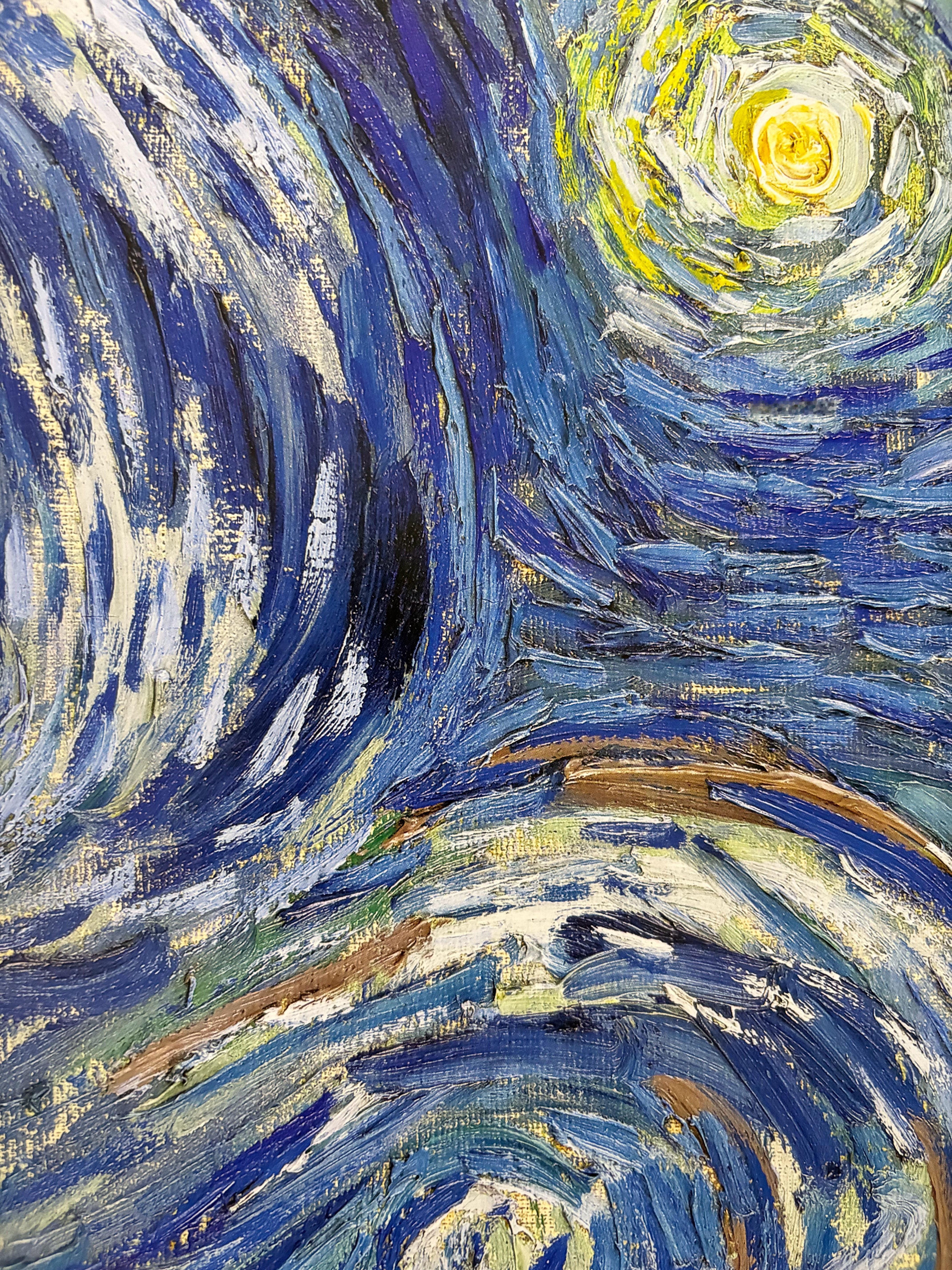 印象派画作的一个特色就是近距离观察时的笔法颜色似乎杂乱而无序,但慢慢远离后颜色又组合成迷人且有冲击力的光影色彩效果,甚至不写实的图案似乎都是合理的视觉反馈。纽约现代美术馆藏 梵高 1889年《星夜》
