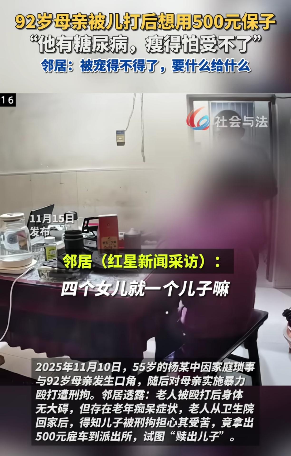 93岁被打老人出院后第一视角拿出500元雇车去派出所,想保出杨某中,心里早已原谅儿子了! 邻居说“她还当他是儿子”,心疼他有糖尿病,在监狱里身体受不了,老人似乎忘了自己才从卫生院回来,虽然身体没什么大碍,可遭了此次欧哒以后,老人的老年痴呆症状加重了,难怪杨某中敢如此嚣张跋扈,都是老人家给惯的! 老人宠了杨某中一辈子,咱也不知道他这些天在里面想通了没有?
