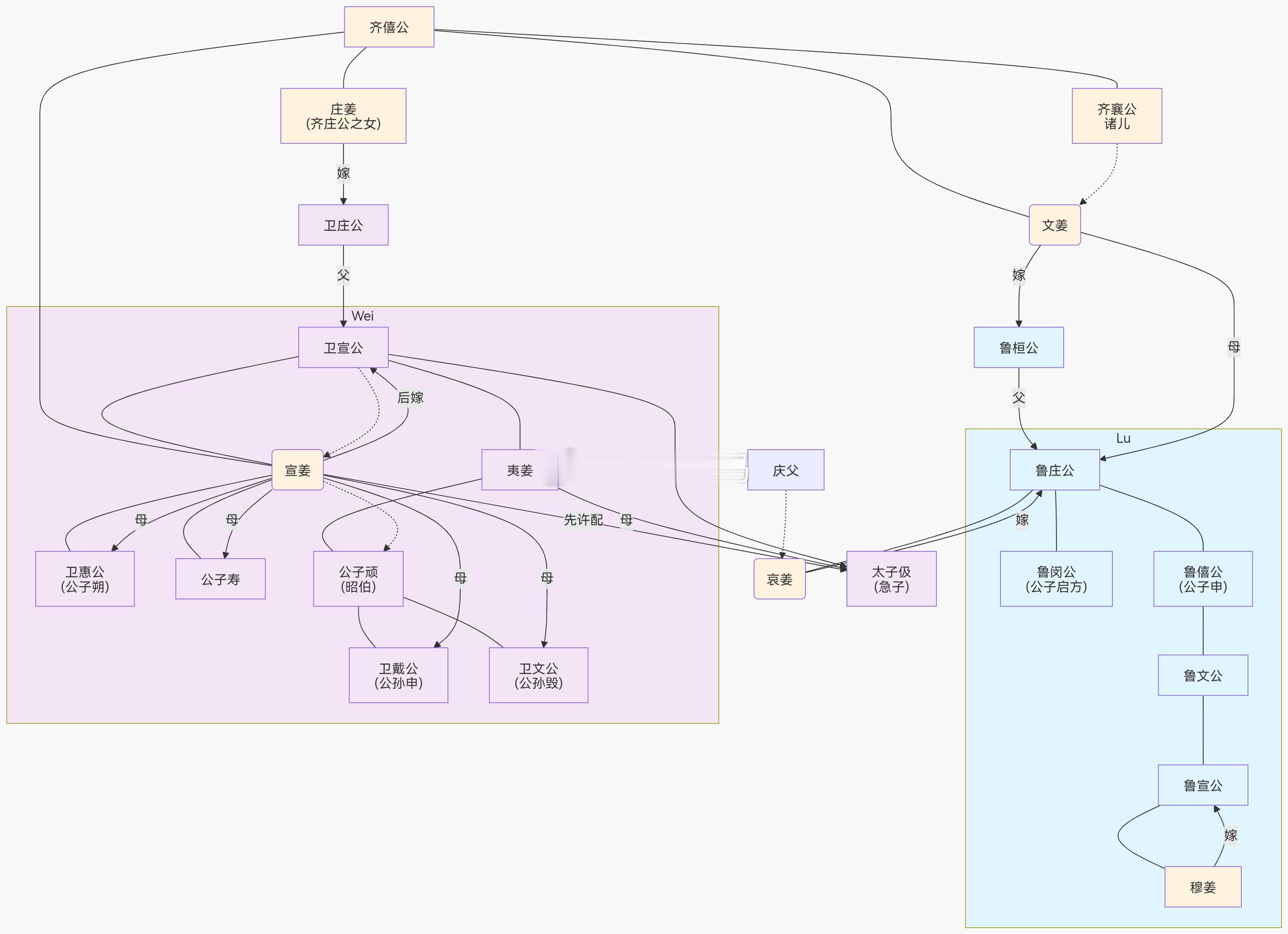 很多粉丝一翻开东周那段历史,就被各种“X姜”绕晕了,关键是这些“X姜”不仅名字差不多,连事迹也差不多,大部分都是搞破鞋乱政的事。那么为啥“X姜”这个名字这么有毒呢?这些“X姜”到底是什么关系呢?首先说下这个命名规则,“姜”是她们的姓,用“X姜”来称呼说明了她们都是齐国公室出身。这个X的来源就不一样了,主要是几种:1 从夫:使用丈夫的谥号,如嫁给卫庄公的庄姜。2 从己:使用自己死后的谥号,如文姜、宣姜。3 特征:使用国名或其他特征,如齐姜(泛称)、棠姜(来自棠地)。下面挨个跟大家说这些“X姜”的事迹。先说庄姜,她是齐庄公的女儿,出身高贵,嫁给卫庄公后没有儿子,就抚养了卫庄公的妾室戴妫的儿子公子完,即卫桓公。她本人没有任何不良记录,反而以美貌和品德出众被歌颂。《诗经·卫风·硕人》写的就是她:硕人其颀,衣锦褧衣。齐侯之子,卫侯之妻,东宫之妹,邢侯之姨,谭公维私。手如柔荑,肤如凝脂,领如蝤蛴,齿如瓠犀,螓首蛾眉,巧笑倩兮,美目盼兮。尽管庄姜美丽又身份高贵,却因为“无子”被冷落,她抚养的之子公子完(卫桓公)也在州吁之乱中被杀。此后,卫国迎回了在邢国当人质的公子晋即位,史称卫宣公。卫宣公在破鞋方面建树良多,他还在当公子的时候,就和老爹卫庄公的一个妾私通。这个妾也是来自齐国,叫做夷姜,可能是嫡母庄姜出嫁时候的媵妾。夷姜和公子晋不仅私通,还生下了一个孩子急子,可能是生的时候特别急吧。卫宣公即位后,立夷姜为夫人,急子为太子,史称太子伋。感觉这就是上一个版本武则天的故事?别急,很快这个故事就急转直下了。太子伋长大后,老爹卫宣公就要给他娶媳妇,娶的还是齐国公主,是齐僖公的女儿。这位齐僖公,就是卫宣公嫡母庄姜的兄弟,所以他给儿子娶的儿媳,正是嫡母的侄女,名叫宣姜。宣姜和姑姑一样,长得特别美,所以卫宣公一看,就不舍得给儿子了,还在黄河边筑新台,将她占为己有。《诗经》有一首《新台》讲的就是这件事情:新台有泚,河水弥弥。燕婉之求,籧篨不鲜。新台有洒,河水浼浼。燕婉之求,籧篨不殄。鱼网之设,鸿则离之。燕婉之求,得此戚施。这个宣姜不是省油的灯,她和卫宣公生下公子寿和公子朔,她原来的未婚夫太子伋的母亲夷姜因此失宠,上吊自杀。为了立自己的儿子为太子,宣姜与公子朔构陷太子伋。卫宣公听信谗言,于是他派太子伋出使齐国,派人冒充盗贼在卫国边境莘地等着。卫宣公交给太子伋白色的旄节,而告诉莘地的强盗,看见手拿白色旄节的人就杀掉他。毕竟边境是三不管地区,发生啥事都好解释。没想到宣姜生了个特别友爱仁义的儿子,她的长子公子寿知道了母亲和弟弟的阴谋,力劝大哥太子伋不要去。太子伋认为不能违背父亲的命令,公子寿只好在行前把他灌醉,偷走太子伋的白色旄节,假扮他先去了边境。盗贼一看,白色旄节,对上了,就杀了他。随后太子伋赶到,看到弟弟的尸体,大哭,对强盗说:“应该杀掉的是我。他有什么罪?请杀死我吧!”于是他也被杀了...不是大哥你这...图啥????卫国人对这两位无辜公子的悲剧感到十分哀痛,赋诗《二子乘舟》纪念两人。二子乘舟,泛泛其景。愿言思子,中心养养!二子乘舟,泛泛其逝。愿言思子,不瑕有害。虽然折损了一个儿子,但是宣姜还是得到了自己想要的。卫宣公死后,她的儿子朔即位为卫惠公。想也知道,这种人品,没法服众,所以卫惠公很快被推翻,逃到了齐国。齐国此时国君是卫惠公的舅舅齐襄公,他派大军镇压了卫国的动乱,强行扶卫惠公上位,但卫国国内依然各种看不上他。最后,齐襄公为了平定卫国的形势,也是为了继续控制卫国,发挥宣姜的政治影响力,就强迫卫宣公的另一个儿子公子顽(昭伯)娶了庶母宣姜。而这个公子顽的母亲,就是之前上吊的那个夷姜!宣姜和公子顽结婚后,又生了三子二女。卫惠公死后,他的儿子卫懿公胡作非为,后来被北狄所杀。卫国最后拥立了宣姜和昭伯的儿子公孙申为卫戴公。卫戴公在位仅仅一年就去世了,于是国人又拥立了卫戴公的弟弟公孙毁为卫文公。等于宣姜的第一任未婚夫是太子,然后她嫁给了公公,生了两个儿子,一个儿子死了,一个儿子成为国君;然后她嫁给了庶子,又生了两个国君....哦对了,这个庶子还是她第二任丈夫和庶母所生....不行,太乱了....你以为这就到极限了?远没有!重量级的来了!宣姜的妹妹文姜,以才华闻名(“文”即有文采),出嫁前就和齐襄公(诸儿)关系暧昧。后来她嫁给了鲁桓公,出嫁多年后,随丈夫鲁桓公访问齐国,然后就被请入后宫,叙姑嫂姐妹之情。但是后宫所有公主嫔妃都没有见到这位文姜,她跑去和哥哥齐襄公旧情复燃了....这事被鲁桓公知道后,齐襄公一不做二不休,直接杀害了鲁桓公....乱伦一时爽,老公火葬场...这位文姜和老公生的儿子,就是鲁庄公。鲁庄公没有吸取他爹的教训。他舅舅齐襄公杀了他爸爸,他却娶了舅舅的女儿(也有说孙女),史称哀姜。这个称号一看就知道,得继续出人命。鲁庄公迎娶哀姜的过程中,基本打破了当时一切可以打破的规矩,而且还没结婚的时候,他就曾经去齐国看望哀姜,被指是“未娶而先淫”。哀姜嫁到鲁国后,一直没有儿子,就抚养了自己陪嫁媵女叔姜所生的儿子公子启方。但是鲁庄公娶哀姜的时候,都三十六岁了,之前他就生了公子般。鲁庄公想立长子公子般为继承人,但是朝廷里没有人支持,尤其是鲁庄公的弟弟