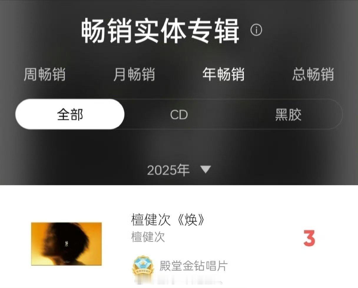 檀健次的实体专辑达成《焕》年榜第三、总榜第十成就,是备受檀丝喜爱的二公主啊