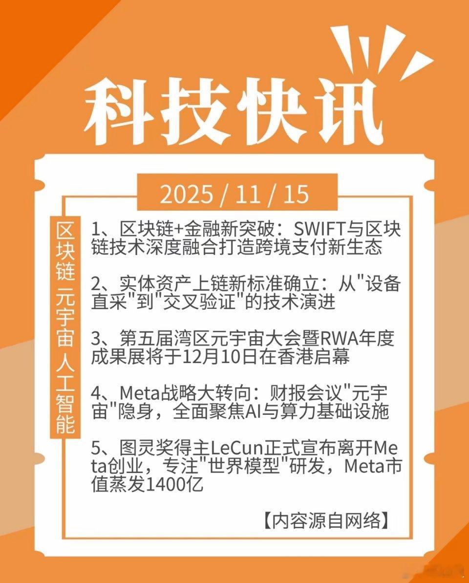 科技快讯 | 11月15日 星期六1、区块链+金融新突破:SWIFT与区块链技术深度融合打造跨境支付新生态2、实体资产上链新标准确立:从"设备直采"到"交叉验证"的技术演进3、第五届湾区元宇宙大会暨RWA年度成果展将于12月10日在香港启幕4、Meta战略大转向:财报会议"元宇宙"隐身,全面聚焦AI与算力基础设施5、图灵奖得主LeCun正式宣布离开Meta创业,专注"世界模型"研发,Meta市值蒸发1400亿—内容源自网络—、、