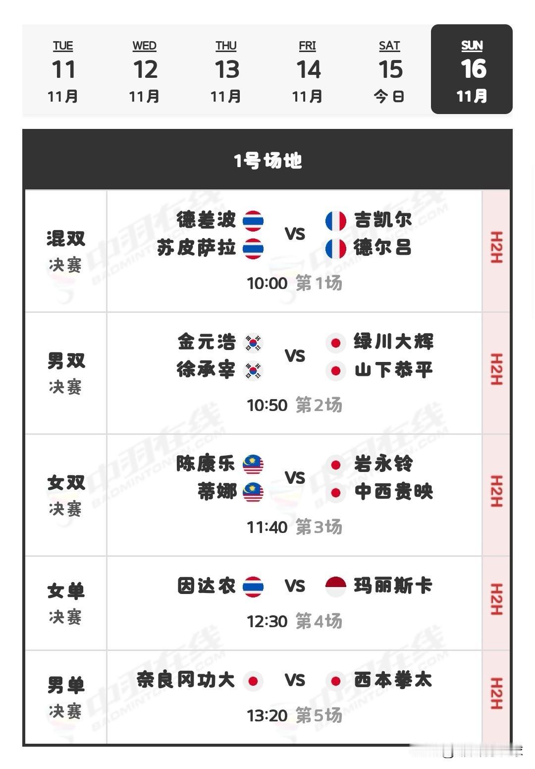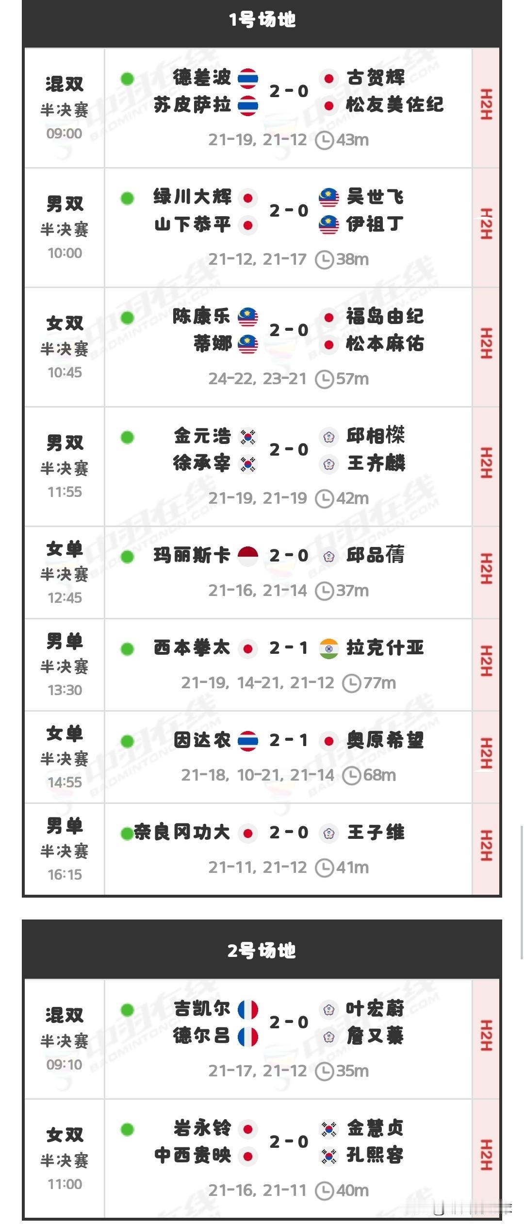 11月16日日本羽毛球大师赛决赛对阵安排 今天的半决赛刚刚全部结束,中国台北今天的三场比赛全输,全部出局,无人晋级决赛。 明天决赛北京时间10:00开始,因达农vs玛丽斯卡,西本拳太vs奈良冈功大,明天决赛详细对阵安排和今天半决赛详细战报如下: 羽毛球 羽毛球爱好者 羽毛球比赛 羽毛球赛程 羽毛球大师赛