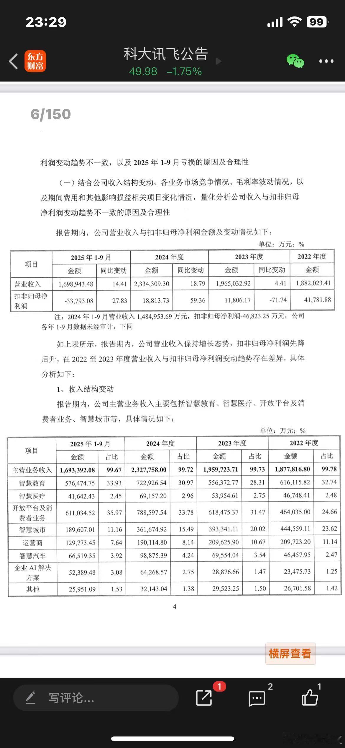 讯飞1-9月主营业务的收入情况:🍎🌹智慧教育收入57.64亿智慧医疗收入5.76亿开放平台与消费者业务收入61.1亿智慧城市收入18.96亿运营商收入12.97亿智慧汽车收入6.65亿企业AI解决方案收入5.23亿其它收入2.59亿
