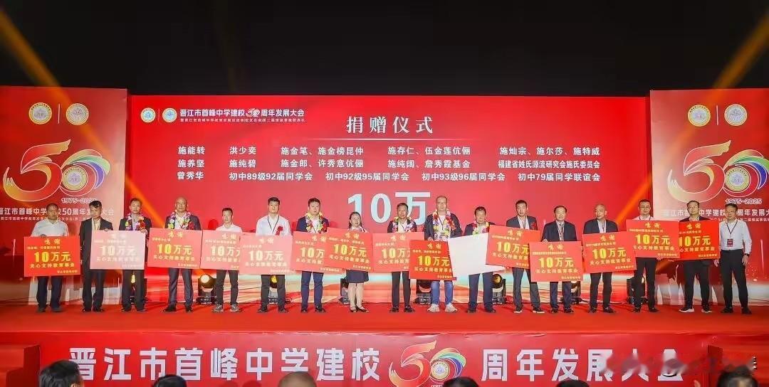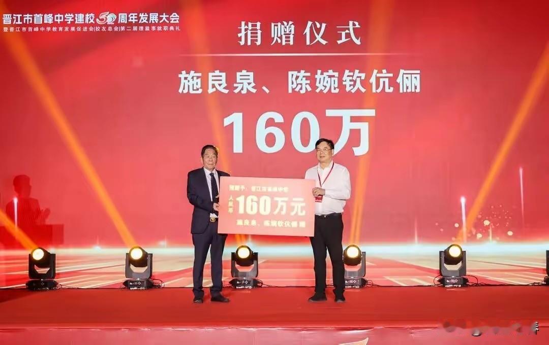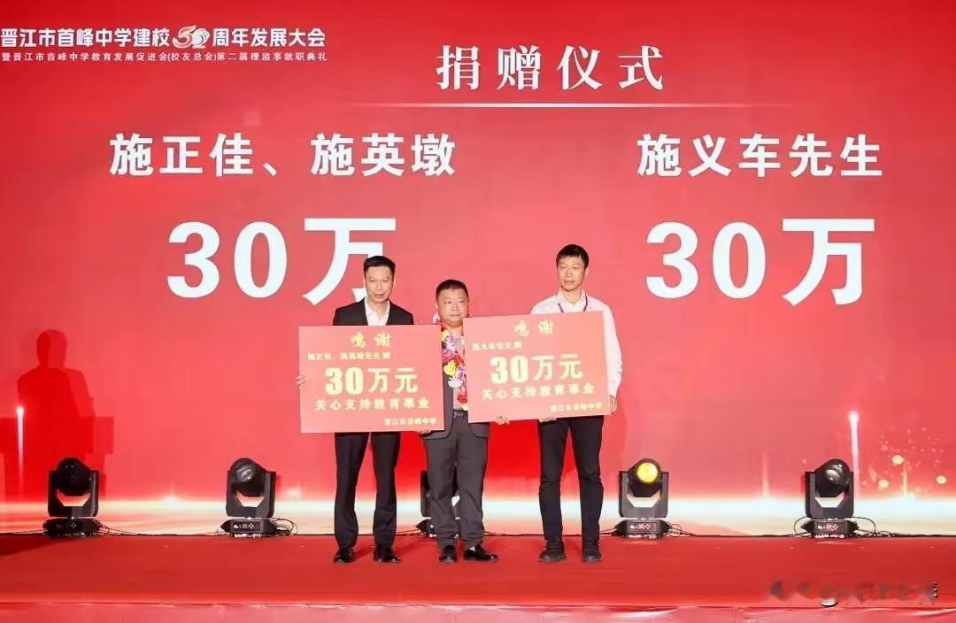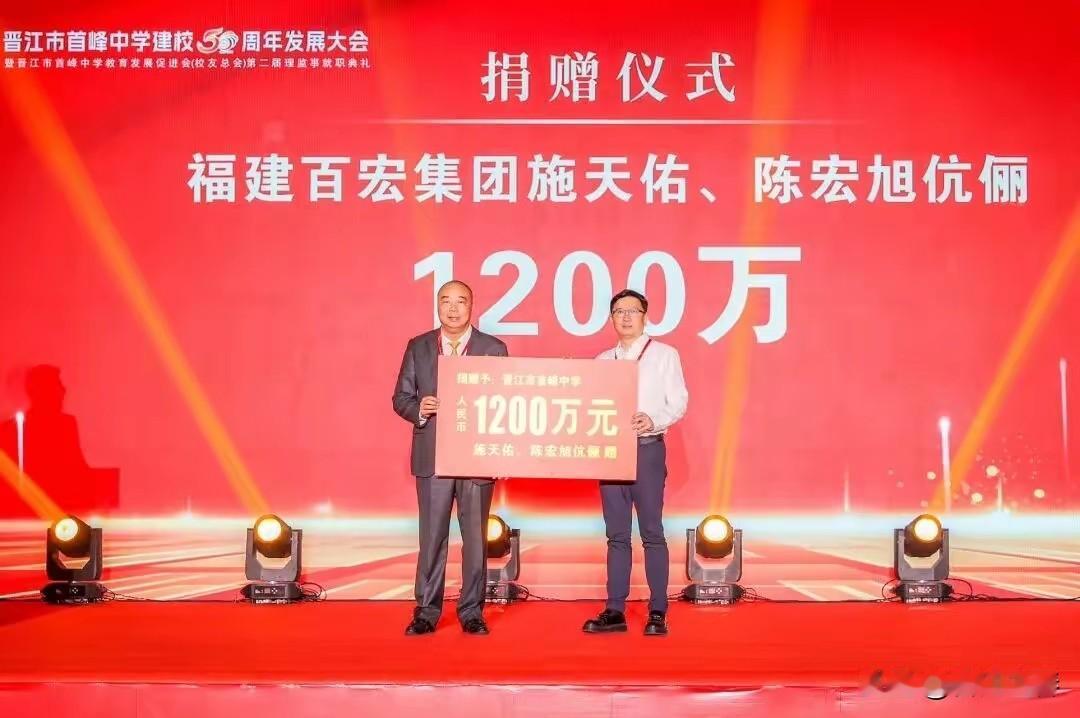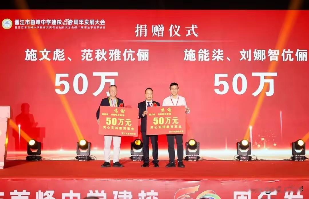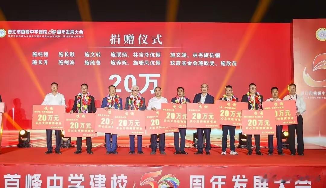 晋江市深沪首峰中学建校50周年暨首峰中学校友会第二届监理事就职典礼之际,收到乡贤、华侨、校友及各界爱心人士的捐款。 晋江百宏集团施天佑、陈宏旭伉俪捐赠1200万元 施良泉、陈婉钦伉俪捐赠160万元 施文彪、范秋雅伉俪捐赠50万元 施能柒、刘雅智伉俪捐赠50万元,还有收到30万、20万、10万或几万等捐款,善款高达2000多万元。 晋江市首峰中学位于福建省晋江市深沪镇首峰村,成立于1975年,原为首峰学校附设初中部。1993年,旅菲爱国华侨施能炒先生等人投资建校,1995年从附中校搬迁,成立首峰中学。1998年,学校因教育事业发展需要升格为普通完中校