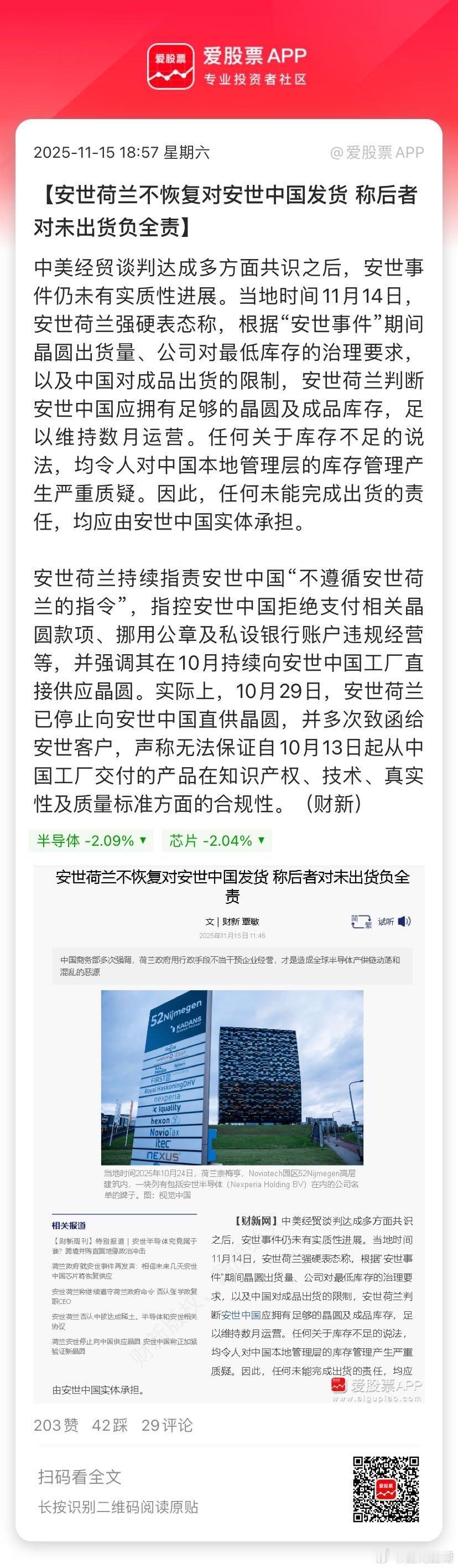 【安世荷兰不恢复对安世中国发货 称后者对未出货负全责】中美经贸谈判达成多方面共识之后,安世事件仍未有实质性进展。当地时间11月14日,安世荷兰强硬表态称,根据“安世事件”期间晶圆出货量、公司对最低库存的治理要求,以及中国对成品出货的限制,安世荷兰判断安世中国应拥有足够的晶圆及成品库存,足以维持数月运营。任何关于库存不足的说法,均令人对中国本地管理层的库... 打劫惯了 又想继续打劫?