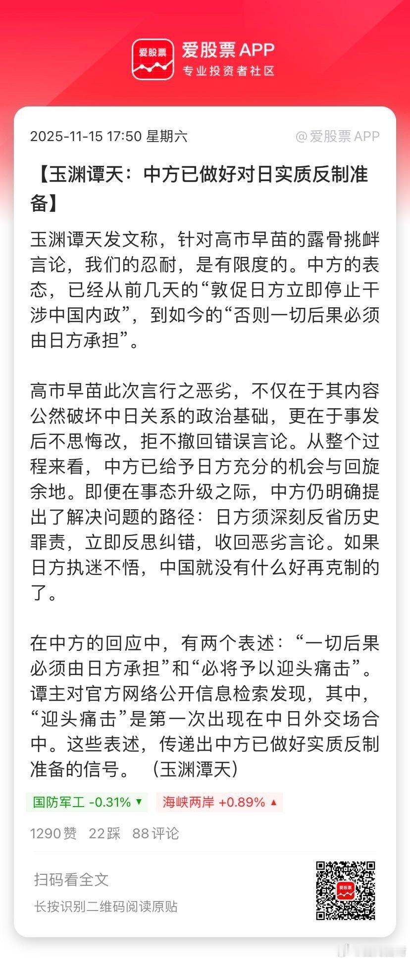 【玉渊谭天:中方已做好对日实质反制准备】玉渊谭天发文称,针对高市早苗的露骨挑衅言
