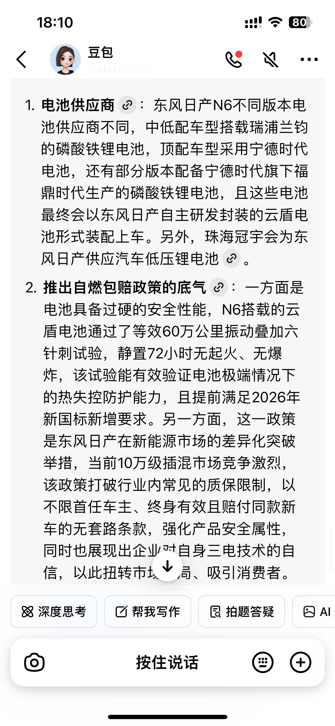 今年所有买车的都会后悔,因为合资新能源开始发疯了! 电池自燃整车包赔! 没有任何条件,没有任何小字! 东风日产N6向所有友商宣战! 预计明年所有合资新能源和外资新能源都会放大招,东风日产N6只是个开始! 东风日产N6用的谁家电池,哪来的勇气说“自燃包赔?” 中低配车型搭载瑞浦兰钧的磷酸铁锂电池;顶配车型采用宁德时代电池; 还有部分版本配备宁德时代旗下福鼎时代生产的磷酸铁锂电池; 这些电池都是东风日产自主研发封装的云盾电池形式装配上车。