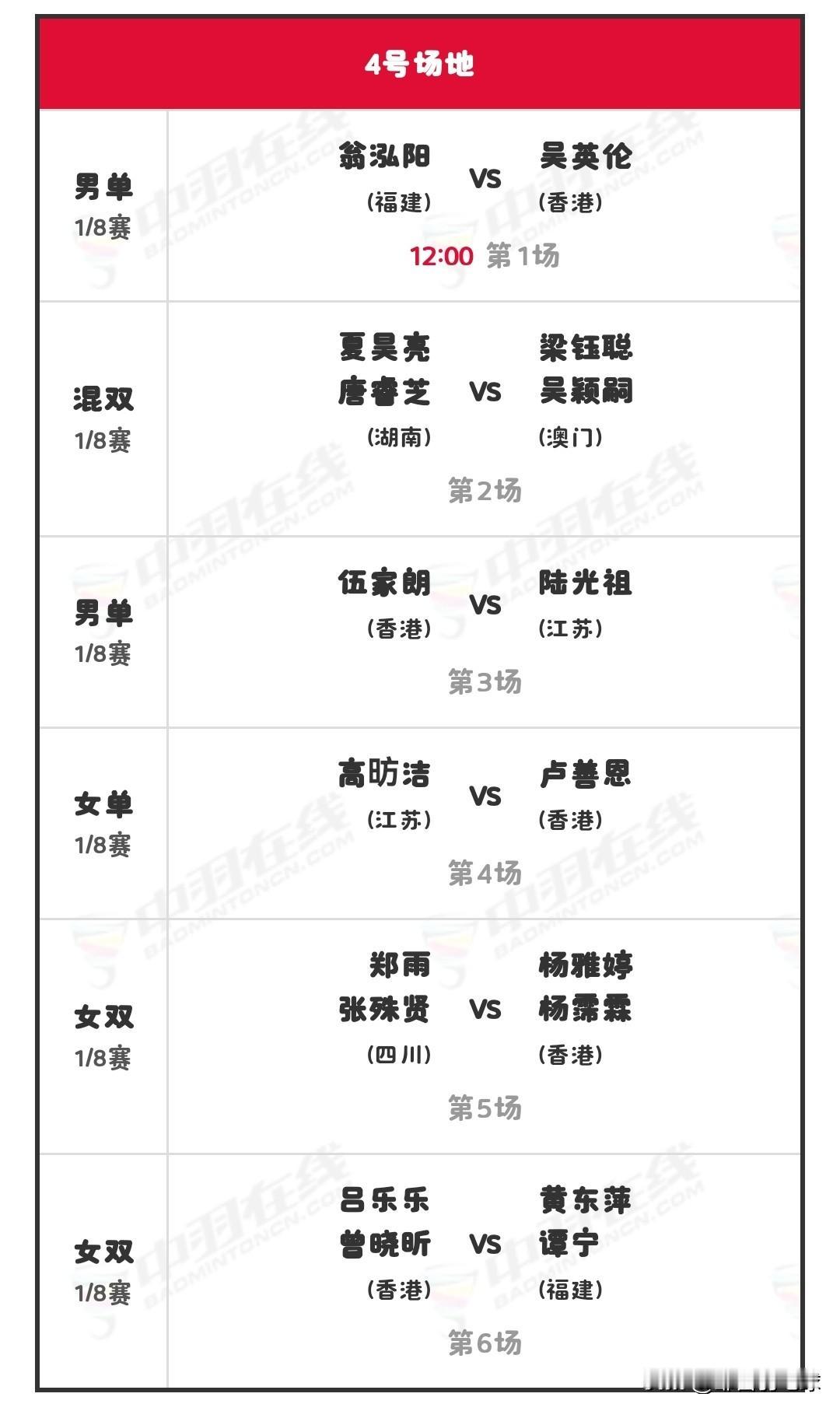 11月16日全运会羽毛球单项赛1/8决赛对阵安排 今日,首轮全部比赛刚刚落下帷幕。李卓耀(香港)以1-2的比分不敌刘亮(湖南);在昨日团体决赛中表现神勇、差点击败石宇奇的孙超(浙江),连输两局,被吴英伦(香港)淘汰,首轮即遭淘汰。 明日12:00开始,将进行1/8决赛,七个场地同时开赛。明日对阵分别为:石宇奇vs刘海超,翁泓阳vs吴英伦,李诗沣pk周新宇,王正行pk赵俊鹏,陆光祖vs伍家朗,雅思组合登场,详细对阵安排如下: 国羽赛程 羽毛球 羽毛球爱好者 羽毛球比赛 羽毛球赛事 石宇奇 李诗沣 2025第十五届全运会 2025年第十五届全运会羽毛球比赛