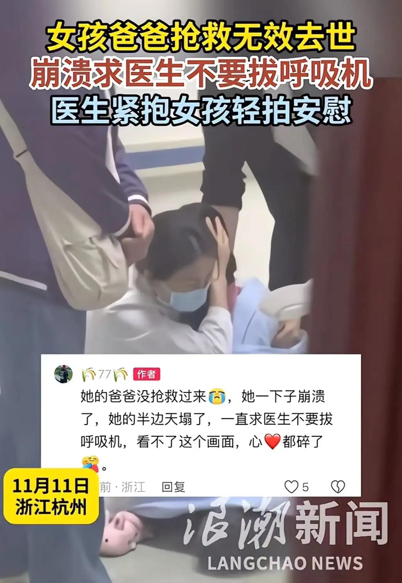 浙江杭州,女孩爸爸抢救无效去世,崩溃求医生不要拔掉呼吸机,医生的行为令人泪目!网友:这种悲痛我能理解,我10岁丧母,30岁丧父,户口本我是户主了!好好的活着! 在这个喧嚣的城市角落,发生了一件令人心碎的事情:浙江杭州,一位年轻女孩的父亲在抢救无效后离开了这个世界。面对生命的终结,她的父亲在弥留之际,拼尽全力请求医生不要拔掉呼吸机,那一刻,所有人都被深深震撼。医生的行为,令人泪目,也让无数网友心头一紧——他们似乎都能感受到那份无法言喻的绝望与爱。 有人说,生命有时候就像一场无声的抗争。面对死亡的阴影,没有人能做到冷静。那位父亲的请求,不仅仅是对生命的渴望,更是一份对家庭、对未来的执念。或许,他知道,生命的终点只是时间的问题,但那一刻,他用尽所有力气,想要再多留一秒,哪怕只是为了女儿多看一眼。 这件事引发了广泛的共鸣。网友们纷纷留言:**“这种悲痛我能理解,我10岁丧母,30岁丧父,户口本我是户主了!好好的活着!”**这句话简单,却深刻地揭示了人性中最真实的渴望——珍惜生命,珍惜每一个还在身边的人。 我们常常在日常的忙碌中忽略了生命的宝贵。也许,是因为习惯了生老病死的自然规律,渐渐变得麻木;也许,是因为面对死亡的恐惧,我们选择了逃避。然而,正是这些悲剧,提醒我们:生命如此脆弱,珍惜当下,才是最重要的课题。 有人说,医生的每一个决定都像是在和死神赛跑。在那一刻,他们的选择不仅关乎技术,更关乎人性的善良与温暖。那位医生的坚持,或许只是为了给逝者一份尊严,也给活着的人一份希望。或许,他知道,生命的最后一刻,最需要的不是冷漠的机械操作,而是人性中最温暖的那一面。 这起事件让我们反思:在面对生死的边缘,我们是否还能保持一份人性?在这个快节奏的社会中,我们是否还记得,生命的意义远比金钱和名利更为珍贵?我们每个人都可能成为那位父亲,或许也会成为那位医生。 生命的意义,或许就在于我们在有限的时间里,能否用爱与善良,点亮彼此的生命。让我们用心去感受,用行动去守护。因为,只有这样,我们才能在这个世界上,活得更有价值,更有温度。爸爸去世 爸爸弥留之际