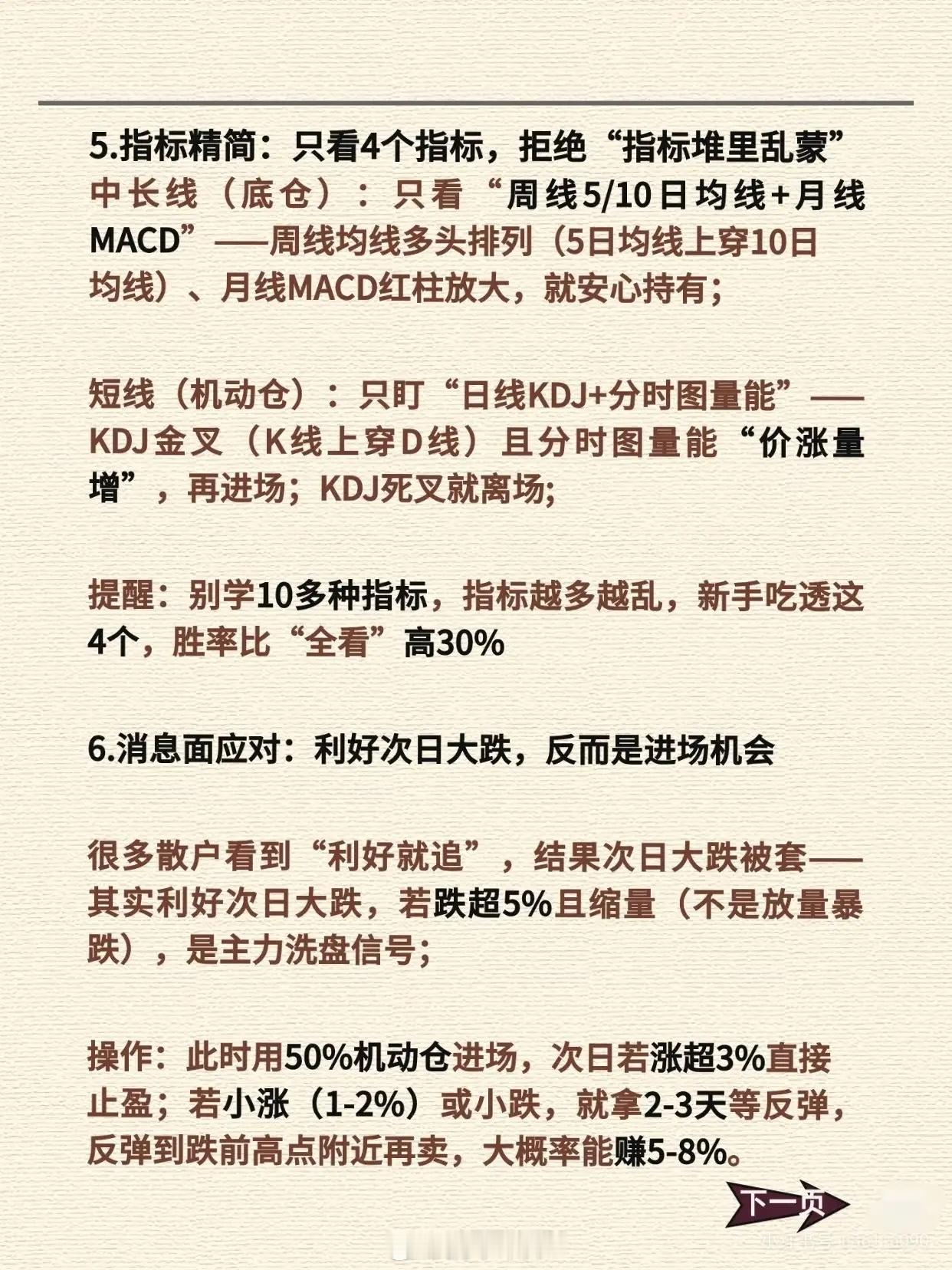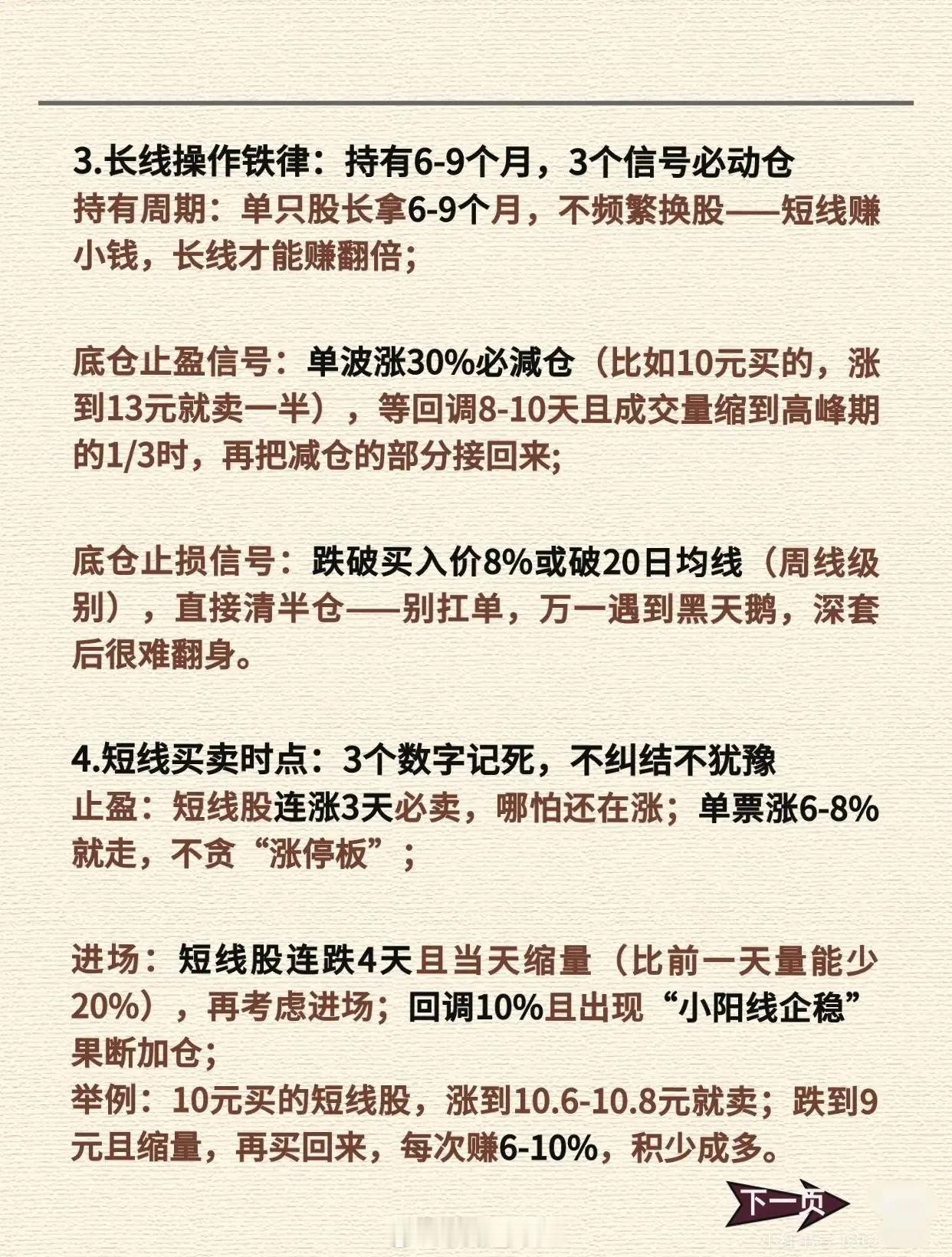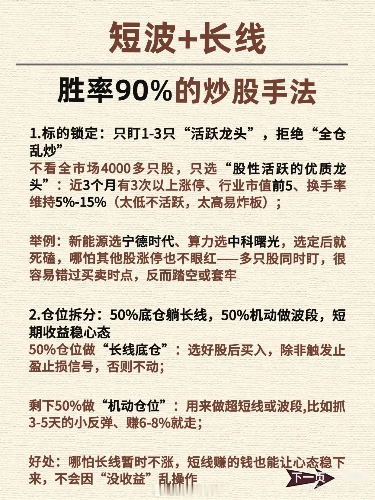 这是一套完整的“短波+长线”复合型炒股策略,核心是通过“1-3只活跃龙头股+底仓长线+机动波段”组合操作,辅以精准指标、严格止损和情绪管理,目标实现胜率90%的高效盈利。以下是策略的完整总结:一、核心框架:1-3只活跃龙头股+仓位拆分1. 标的锁定:只聚焦1-3只“股性活跃的优质龙头”(拒绝全市场撒网)。 - 选股标准:近3个月有3次以上涨停、行业市值前5、换手率维持在5%左右(太低不活跃,太高易炸板)。 - 举例:新能源选宁德时代、算力选中科曙光,选定后“死磕”一只,避免因多股分散精力错过买卖时点。2. 仓位拆分:50%底仓做长线(躺平),50%机动仓做波段(灵活)。 - 长线底仓:选好股后买入,除非触发止盈止损信号否则不动,长期持有(6-9个月为目标)。 - 机动仓位:用于超短线或波段操作(如抓3-5天小反弹,赚6-8%就走),平衡心态(长线未涨时,短线盈利可稳定操作信心)。二、长线与短线的具体操作规则长线操作铁律(底仓)- 持有周期:6-9个月,不频繁换股(靠长线赚翻倍,短线赚小钱过渡)。- 止盈信号:单波上涨30%必须减仓(如10元买涨到13元,卖一半),回调8-10天且成交量缩至高峰期1/3时,再接回减仓部分。- 止损信号:跌破买入价8% 或 周线级别跌破20日均线,直接清半仓(避免黑天鹅深套)。短线操作时点(机动仓)- 止盈:连涨3天必卖(哪怕还在涨),单票涨6-8%就走(不贪涨停板)。- 进场:连跌4天且当天缩量(比前一天少20%),或回调10%后出现“小阳线企稳”时果断加仓。- 举例:10元买的短线股,涨到10.6-10.8元卖;跌到9元且缩量,买回后每次赚6-10%,积少成多。三、关键辅助策略1. 指标精简(拒绝复杂)- 中长线(底仓):只看“周线5/10日均线+月线MACD”——周线均线多头排列(5日上穿10日)、月线MACD红柱放大时安心持有。- 短线(机动仓):只盯“日线KDJ+分时图量能”——KDJ金叉且量能“价涨量增”时进场,死叉时离场。- 提醒:新手只需掌握这4个核心指标,学过多指标反而混乱(胜率比“全看”高30%)。2. 消息面应对(主力洗盘机会)- 利好消息公布后次日若股价大跌超5% 且 成交量缩量(非放量暴跌),通常是主力洗盘信号。此时用50%机动仓进场,后续操作: - 次日涨超3% → 直接止盈; - 小涨(1-2%)或小跌 → 拿2-3天等反弹至跌前高点附近再卖,大概率赚5-8%。四、特殊信号与风控底线1. 长线仓位特殊信号- 连涨3周必清仓:底仓若连续3周收周线阳线(哪怕未涨30%),先清仓(避免后续回调);回调到第2周且周线收“小十字星”(缩量)时,再买回底仓。2. 止损硬线(必须执行)- 短线止损:买入后跌幅超5% → 立即割肉(短线忌硬扛)。- 长线止损:底仓浮亏8%,或周线跌破10日均线且放量 → 清半仓(跌破关键位及时认亏,保留仓位等下次机会)。五、龙头股筛选与情绪管理1. 真龙头确认(避免伪龙头)- 真龙头在行业上涨时涨幅最大,下跌时跌幅最小。具体方法: - 行业板块涨3%时,该股涨5%以上; - 行业板块跌2%时,该股跌1%以内,且成交量大于板块内其他股票。2. 情绪管理(戒贪戒躁)- 盘前不看“涨停榜”:避免因他人涨停而盲目换股。- 盘中不追“突发异动股”:突然拉升超5%的股票,90%是诱多陷阱,追入易被套。- 收盘不盯“别人的收益”:勿与他人比较节奏,攀比易导致操作失误。六、机动仓优化与日常复盘1. 机动仓动态调整- 50%机动仓并非固定全做短线:若市场无赚钱效应(如全市场涨少跌多),将30%转成活期理财,仅留20%盯短线;待市场出现“赚钱效应”(如每天涨停超50家)时,再将理财资金转回做短线。2. 每日复盘3件事- 记录龙头股“量价异动”(如放量不涨→可能是洗盘);- 核对买卖点是否符合规则(如连涨3天未卖→分析贪心/恐惧原因);- 筛选次日标的(从1-3只龙头中找“回调10%”或“KDJ金叉”信号,提前计划避免盘中慌乱)。总结:这套策略通过“精选龙头+长线打底+波段调节”的组合,配合严格的止盈止损、简化指标和情绪控制,最终实现高胜率(90%)的稳健盈利。核心要点是:聚焦少数优质股、分仓平衡风险与收益、严守纪律不贪不惧。