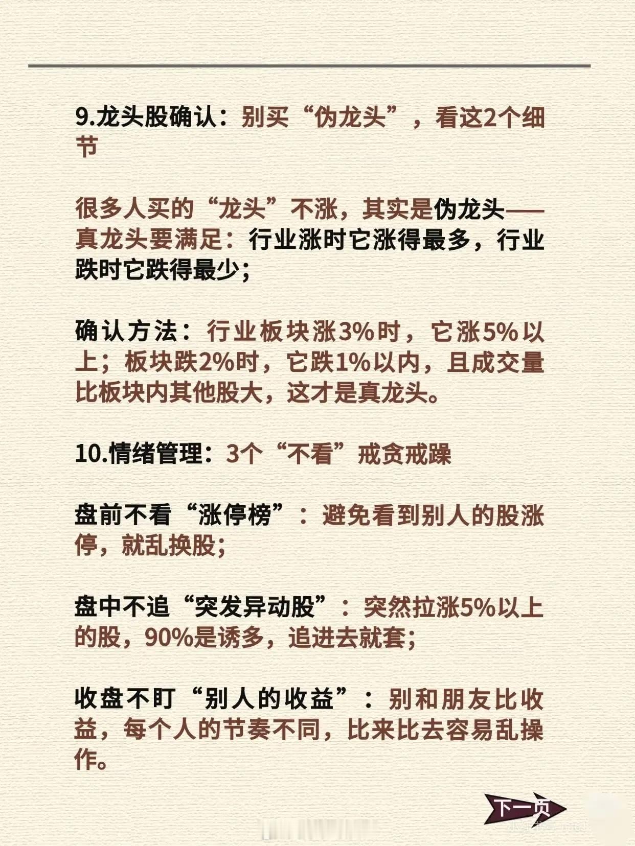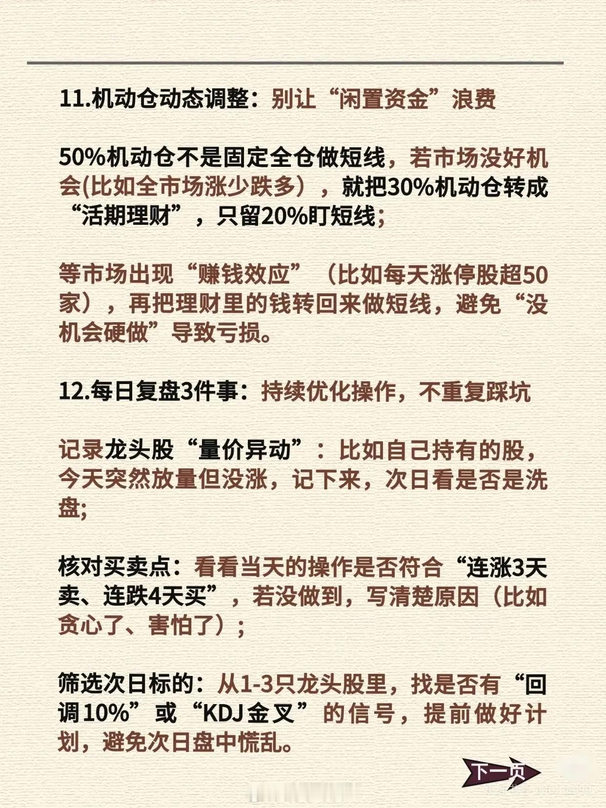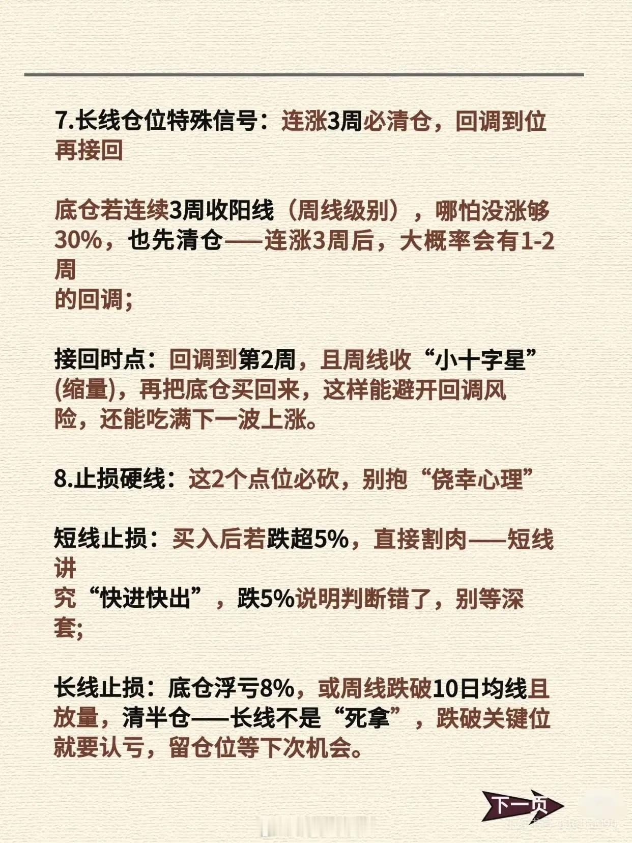 这是一套完整的“短波+长线”复合型炒股策略,核心是通过“1-3只活跃龙头股+底仓长线+机动波段”组合操作,辅以精准指标、严格止损和情绪管理,目标实现胜率90%的高效盈利。以下是策略的完整总结:一、核心框架:1-3只活跃龙头股+仓位拆分1. 标的锁定:只聚焦1-3只“股性活跃的优质龙头”(拒绝全市场撒网)。 - 选股标准:近3个月有3次以上涨停、行业市值前5、换手率维持在5%左右(太低不活跃,太高易炸板)。 - 举例:新能源选宁德时代、算力选中科曙光,选定后“死磕”一只,避免因多股分散精力错过买卖时点。2. 仓位拆分:50%底仓做长线(躺平),50%机动仓做波段(灵活)。 - 长线底仓:选好股后买入,除非触发止盈止损信号否则不动,长期持有(6-9个月为目标)。 - 机动仓位:用于超短线或波段操作(如抓3-5天小反弹,赚6-8%就走),平衡心态(长线未涨时,短线盈利可稳定操作信心)。二、长线与短线的具体操作规则长线操作铁律(底仓)- 持有周期:6-9个月,不频繁换股(靠长线赚翻倍,短线赚小钱过渡)。- 止盈信号:单波上涨30%必须减仓(如10元买涨到13元,卖一半),回调8-10天且成交量缩至高峰期1/3时,再接回减仓部分。- 止损信号:跌破买入价8% 或 周线级别跌破20日均线,直接清半仓(避免黑天鹅深套)。短线操作时点(机动仓)- 止盈:连涨3天必卖(哪怕还在涨),单票涨6-8%就走(不贪涨停板)。- 进场:连跌4天且当天缩量(比前一天少20%),或回调10%后出现“小阳线企稳”时果断加仓。- 举例:10元买的短线股,涨到10.6-10.8元卖;跌到9元且缩量,买回后每次赚6-10%,积少成多。三、关键辅助策略1. 指标精简(拒绝复杂)- 中长线(底仓):只看“周线5/10日均线+月线MACD”——周线均线多头排列(5日上穿10日)、月线MACD红柱放大时安心持有。- 短线(机动仓):只盯“日线KDJ+分时图量能”——KDJ金叉且量能“价涨量增”时进场,死叉时离场。- 提醒:新手只需掌握这4个核心指标,学过多指标反而混乱(胜率比“全看”高30%)。2. 消息面应对(主力洗盘机会)- 利好消息公布后次日若股价大跌超5% 且 成交量缩量(非放量暴跌),通常是主力洗盘信号。此时用50%机动仓进场,后续操作: - 次日涨超3% → 直接止盈; - 小涨(1-2%)或小跌 → 拿2-3天等反弹至跌前高点附近再卖,大概率赚5-8%。四、特殊信号与风控底线1. 长线仓位特殊信号- 连涨3周必清仓:底仓若连续3周收周线阳线(哪怕未涨30%),先清仓(避免后续回调);回调到第2周且周线收“小十字星”(缩量)时,再买回底仓。2. 止损硬线(必须执行)- 短线止损:买入后跌幅超5% → 立即割肉(短线忌硬扛)。- 长线止损:底仓浮亏8%,或周线跌破10日均线且放量 → 清半仓(跌破关键位及时认亏,保留仓位等下次机会)。五、龙头股筛选与情绪管理1. 真龙头确认(避免伪龙头)- 真龙头在行业上涨时涨幅最大,下跌时跌幅最小。具体方法: - 行业板块涨3%时,该股涨5%以上; - 行业板块跌2%时,该股跌1%以内,且成交量大于板块内其他股票。2. 情绪管理(戒贪戒躁)- 盘前不看“涨停榜”:避免因他人涨停而盲目换股。- 盘中不追“突发异动股”:突然拉升超5%的股票,90%是诱多陷阱,追入易被套。- 收盘不盯“别人的收益”:勿与他人比较节奏,攀比易导致操作失误。六、机动仓优化与日常复盘1. 机动仓动态调整- 50%机动仓并非固定全做短线:若市场无赚钱效应(如全市场涨少跌多),将30%转成活期理财,仅留20%盯短线;待市场出现“赚钱效应”(如每天涨停超50家)时,再将理财资金转回做短线。2. 每日复盘3件事- 记录龙头股“量价异动”(如放量不涨→可能是洗盘);- 核对买卖点是否符合规则(如连涨3天未卖→分析贪心/恐惧原因);- 筛选次日标的(从1-3只龙头中找“回调10%”或“KDJ金叉”信号,提前计划避免盘中慌乱)。总结:这套策略通过“精选龙头+长线打底+波段调节”的组合,配合严格的止盈止损、简化指标和情绪控制,最终实现高胜率(90%)的稳健盈利。核心要点是:聚焦少数优质股、分仓平衡风险与收益、严守纪律不贪不惧。