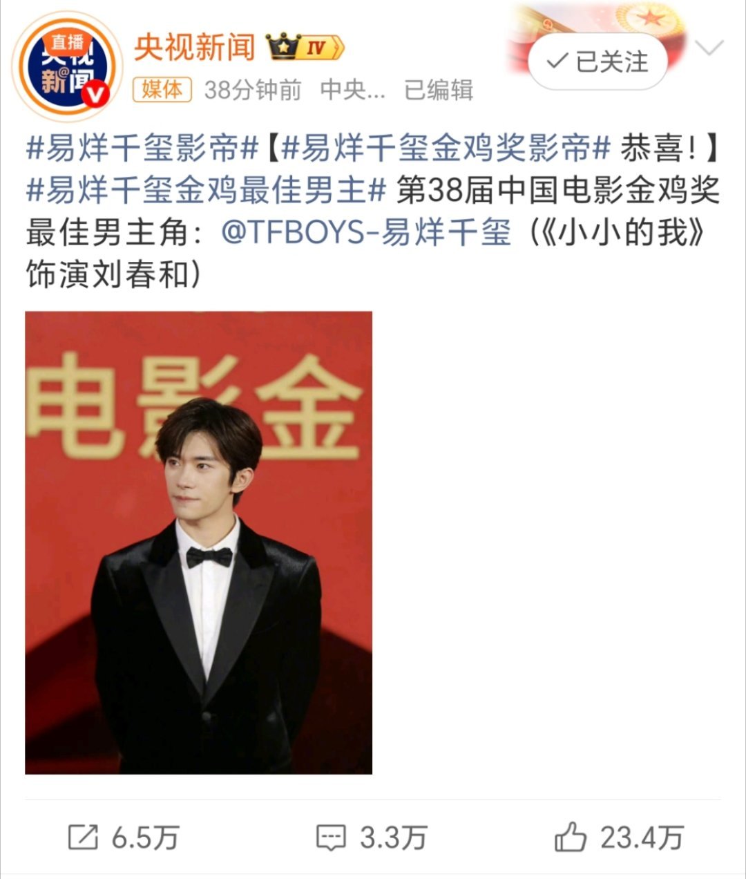 不出所料,果然是易烊千玺拿到了影帝,颜值与实力并存,恭喜易烊千玺。