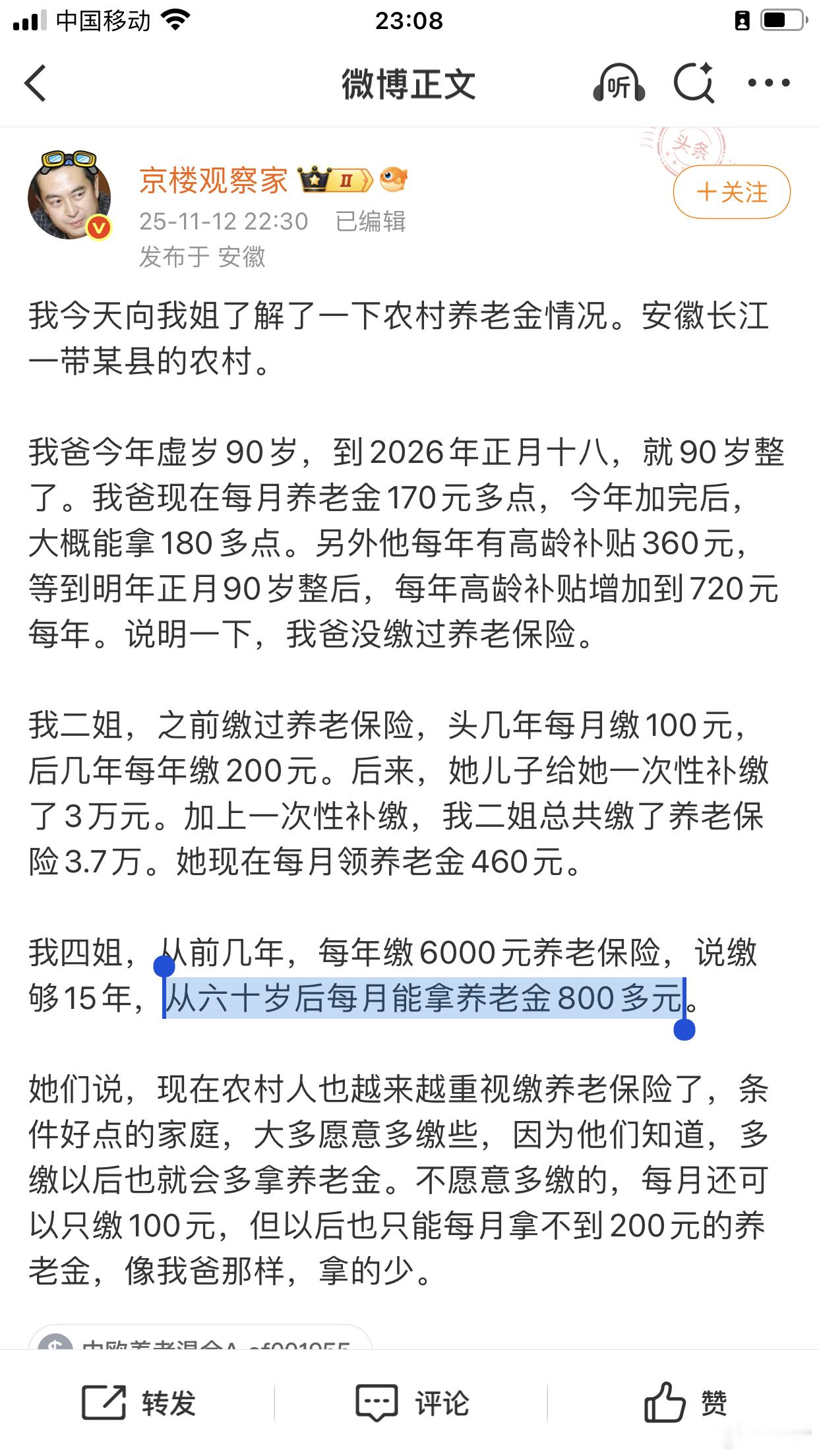 点赞安徽, 今年起每一个农民的养老金提高20+5元,农民的养老金提高25元!好消息,安徽是农业大省,农民大省,一笔刚性支出。 ’注意看留言区,整个安徽省城乡居民养老支出计算,全省有1106万老人,不是个小数目。