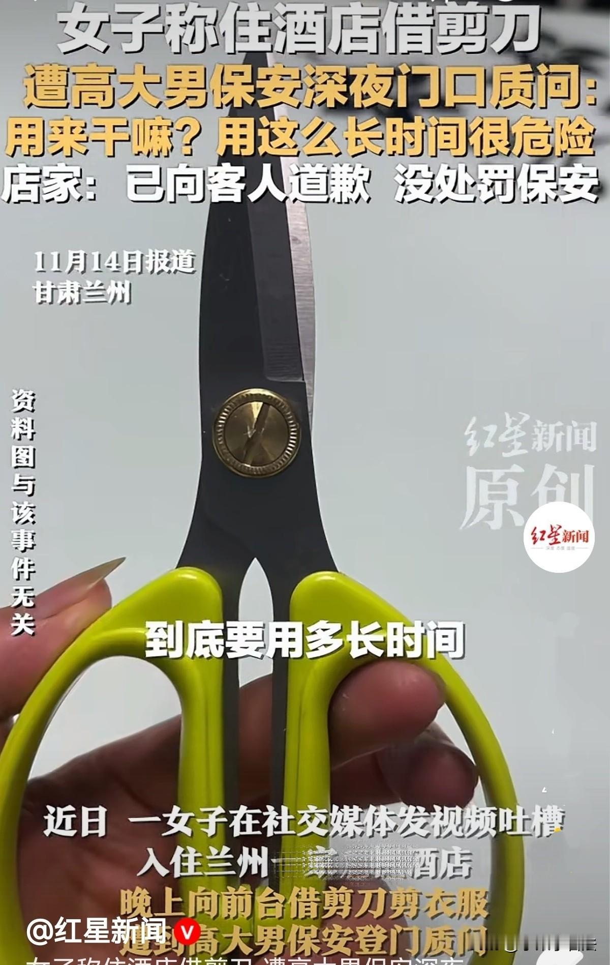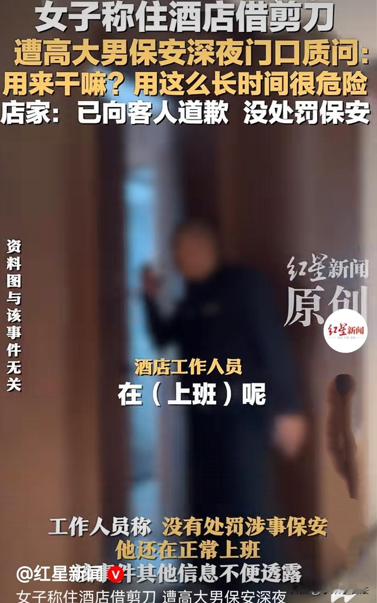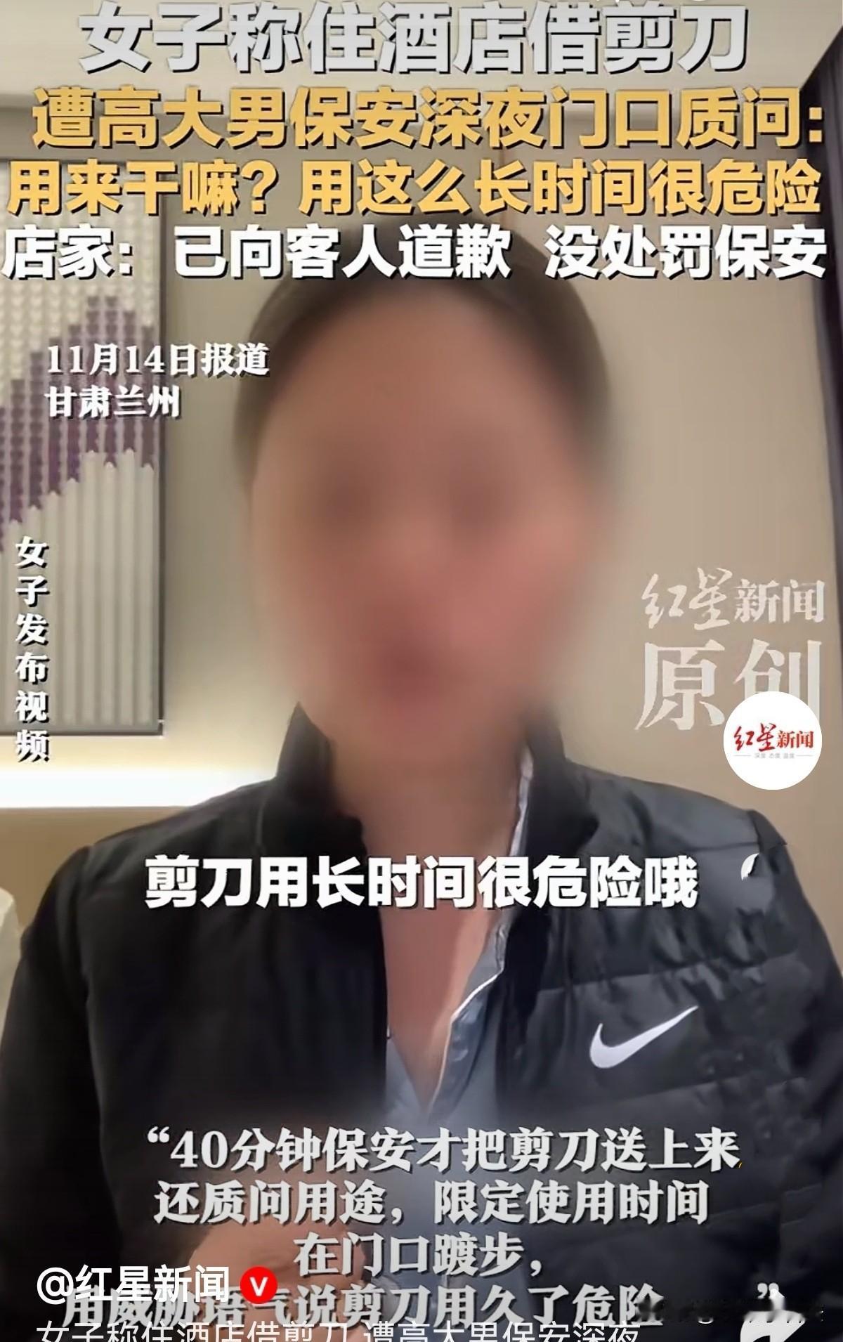 甘肃兰州,女子一人独住一家酒店,晚上10点多给前台打电话借用剪刀,40分钟后,一安保送至女子客房门口,并询问女子用剪刀做什么用,用多久。女子说剪线头,半个小时。安保说20分钟吧,剪刀用久了危险哦!而后他就在客房门口踱步,还往房间望一眼。女子觉得被侵犯,心里不安,便给前台打电话要投诉,要安保姓名,前台拒绝提供这些信息,并说酒店负责人不在需次日解决,女子很生气,将此事发布网上,引热议! 一女子去兰州办事,特意提前订了家看着还不错的酒店,11月11日入住,想着住4天能舒舒服服处理完工作。 结果没想到,就因为借一把剪刀,直接给我整出心理阴影了! 事情是这样的,11月12日那天,忙到晚上10点多,回到酒店才发现白天穿的外套袖口有点线头,看着别扭得慌,就想着找酒店借把小剪刀剪一下。 拨通前台电话后,她特意说了要借剪刀剪线头,前台当时答应得挺痛快,说会让人送上来,我就安心在房间等着了。 结果这一等,足足等了40分钟!本来都快把这事儿忘了,门口突然传来敲门声,我开门一看是个安保大哥,手里拿着一把剪刀。 女子刚想道谢,安保先开口质问她:你借剪刀干啥用啊?要用多久?”我赶紧说就剪个衣服线头。 没想到他直接摆摆手:这个剪刀剪不动线头。女子看了看剪刀说:剪刀挺大也很锋利,可以用。她说不知道会用多久,看安保一直问,就说得半个小时。 安保说:那你得快点,那边还等着用,就20分钟吧,用久了会很危险哦! 女子听安保说这话觉得有点奇怪,她也没多想,接过剪刀正准备关门,转头一看,这安保居然没走,还说在外等她。 女子感觉莫名其妙,一个人在外等她做事,让她有种莫大的负担,她再次让安保先行回去,自己用完就会给前台电话,机器人回头来取就可以了。 谁知,安保就在她客房门口来回踱步,还时不时往房间里望一眼!就是不走。 女子心里“咯噔”一下,瞬间就不舒服了,一个女生独住,还是在外地,这大半夜的,一个高大陌生的男人在门口守着,还往屋里瞟,也太让人膈应了吧?感觉被监视了。 本来借剪刀等了40分钟就够离谱了,现在还被堵门口“监管”使用时间,那种被侵犯隐私的感觉一下子就上来了,再加上他的语气,让她感觉受到了威胁。 心女子里又慌又气,根本没心思剪线头了,在这个酒店要住4天,如果哪天这个安保突然刷卡进入房间,做什么不轨之事…女子浮想联翩,越发恐惧。 她赶紧把门关上,反手就给前台打了电话,想问问这安保到底啥情况,要求提供他的姓名要投诉。 结果前台的回复更让我火大!说安保人员的姓名是隐私,不能透露,还说酒店负责人不在,得等第二天才能处理。 女子当时就炸了:消费者被工作人员这样不当对待,要个姓名投诉都不行?领导不在就没人管了?合着我花钱住酒店,连基本的安全感都没了? 越想越委屈,也越想越不安,她对酒店未能立刻处理这件事很不满意,她觉得这个酒店让像她一样的独行女性住客产生恐惧和安全隐患。 于是,她将这事儿发到网上了,让独身女性住店要提高警惕,注意安全。 然而,此视频发布后,轰动一时,引网友纷纷热议。 11月14日,酒店及那名安保已向女子道歉,女子已退房离开。 安保没受到处罚,仍在上班。 有人说:安保为女子安全考虑才进行提醒,并在门口守候,好心被当成驴肝肺! 有人说:这个酒店完全没有必要向客人道歉,这是一个负责任的酒店,尤其是拥有这么一个负责任的保安是这个酒店的荣幸。应该对这个保安进行褒奖! 安保有错吗?他是个负责任的保安,在酒店里自杀的人多了! 还有人说:倒不是说安保大哥有坏心眼,但换成任何一个女生,大晚上独住,借把剪刀被盘问半天,还被门口盯梢,能不害怕吗? 《民法典》第1032条规定:自然人享有隐私权,宾馆房间属于私密空间,任何组织或个人不得窥视他人宾馆房间等私密空间。 安保在女子明确告知用完会主动联系归还后,仍在门口逗留踱步,还刻意往房间内张望,这种行为超出了合理工作范畴,客观上侵扰了女子的私人生活安宁,符合隐私权侵权的构成要件。 到安保只是担心女子用剪刀存在安全隐患,主观是为确保她安全才在客房门口守候,不应被定位侵犯隐私权。 《民法典》第1198条第1款规定:宾馆等经营场所的经营者,应当对消费者尽到安全保障义务。 女子作为付费住客,与酒店形成住宿服务合同关系,酒店不仅要保障住客的人身财产安全,也需保障住客的心理安全感与隐私安宁。 如女子用酒店剪刀,发生意外事故,酒店仍需承担住客安全保障责任。 所以安保未执行职责,在客房门口守候,是为了保障女子人身安全着想。 但其考虑不够周全,对女子心理安全造成影响,且事后酒店未对安保采取任何约束措施。 这说明酒店存在人员管理疏漏,未充分尽到安全保障义务,应当为此承担相应的侵权责任。 对此您怎么看?