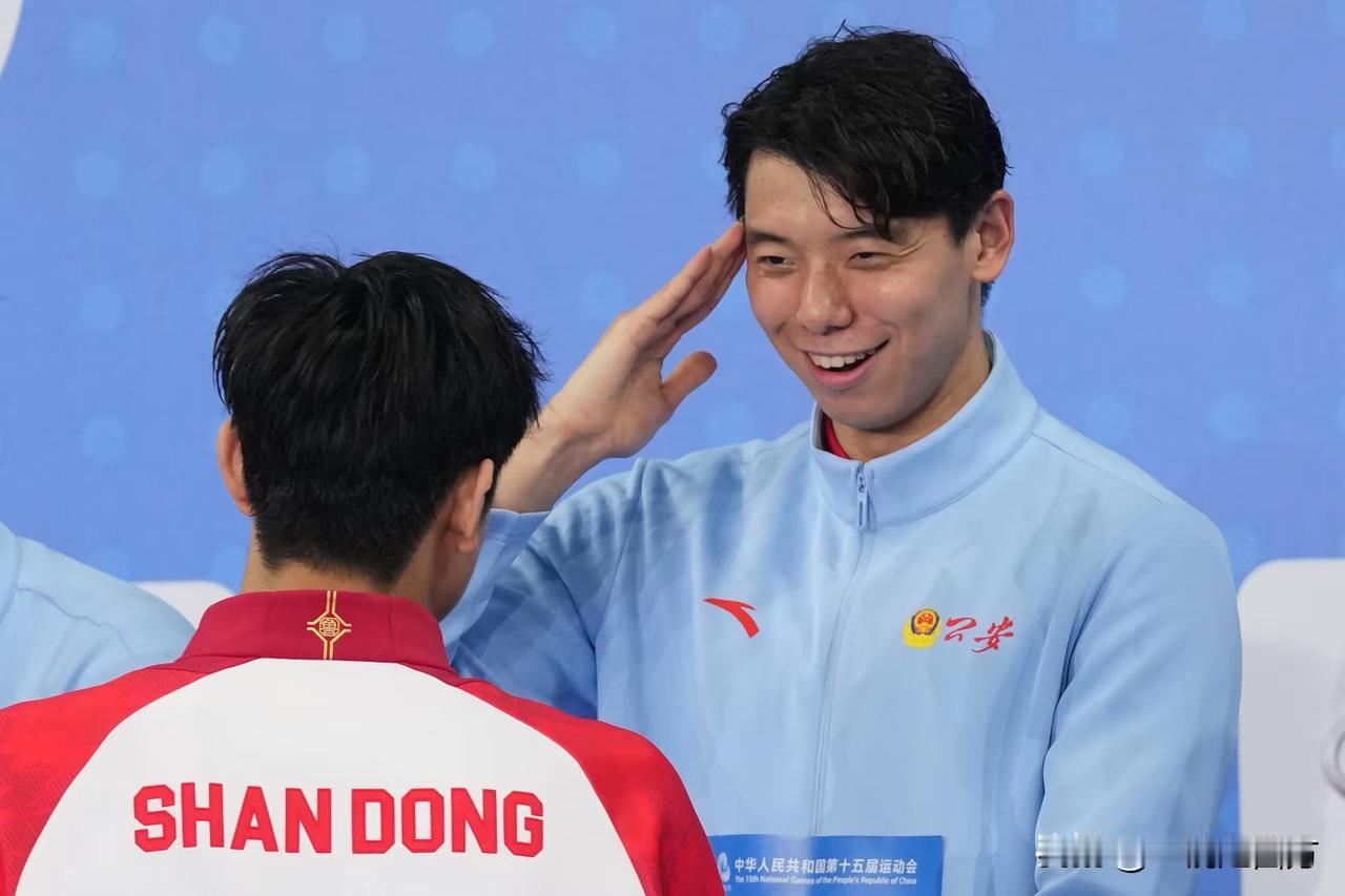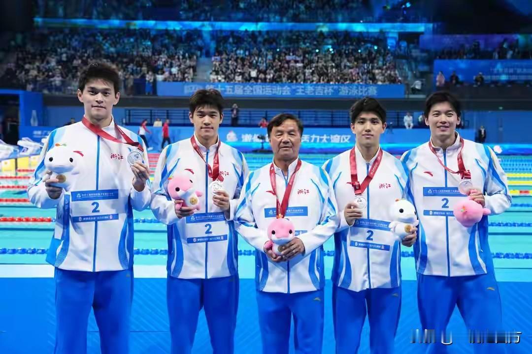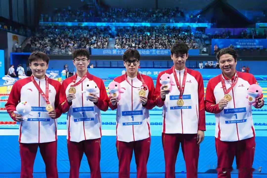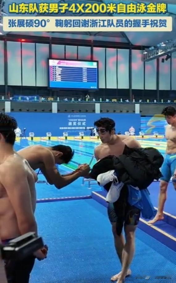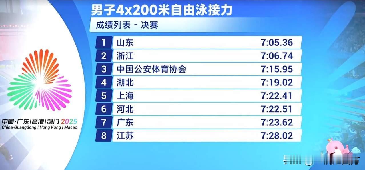第十五届全运会游泳项目昨晚压轴进行的男子4×200米自由泳接力决赛,浙江队继女子4×100米自由泳接力决赛后,又一次遭山东队末棒绝杀,浙江队前三棒是费立纬、孙杨、潘展乐,山东队前三棒是刘培鑫、赵一朴、李易峰,潘展乐交棒给汪顺时以0.47秒的微弱优势保持领先,但山东队最后一棒张展硕是本届比赛三金得主,他展现出强大的实力,700米转身时以0.02秒微弱优势反超,最后50米继续扩大领先近一个身位,最终以1.38秒的优势率先触壁,以7分05秒36夺得金牌,张展硕也获得了本届全运会第四枚金牌,成就“四金王”,赛后,18岁的张展硕90度鞠躬向前辈汪顺握手致意,中国公安体育协会依靠最后一棒季新杰的强力冲刺获得铜牌。
