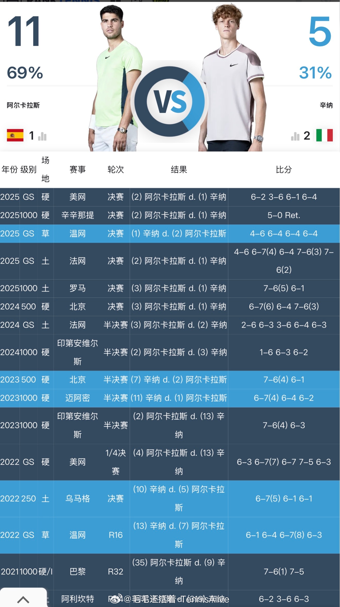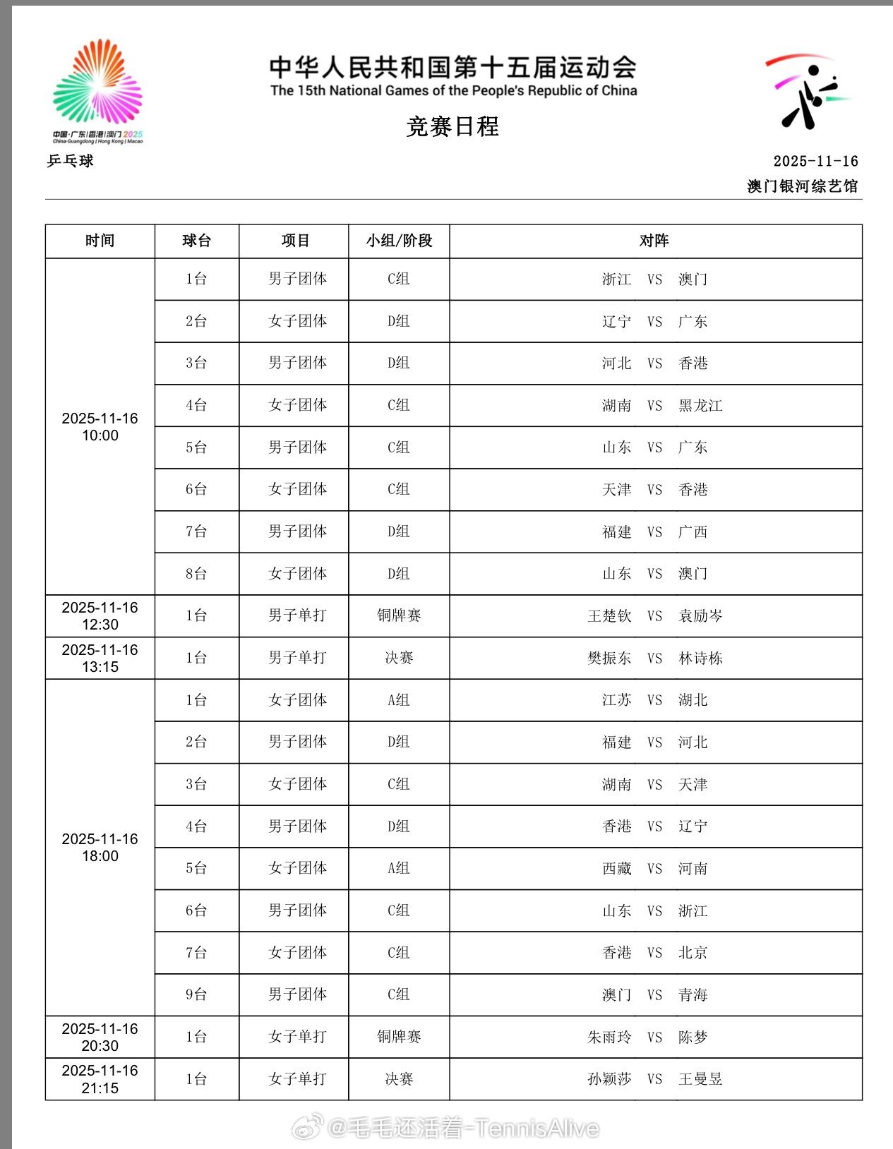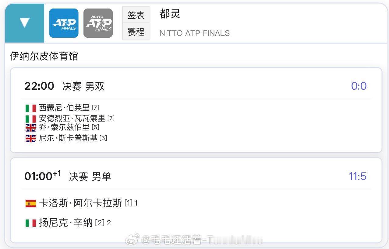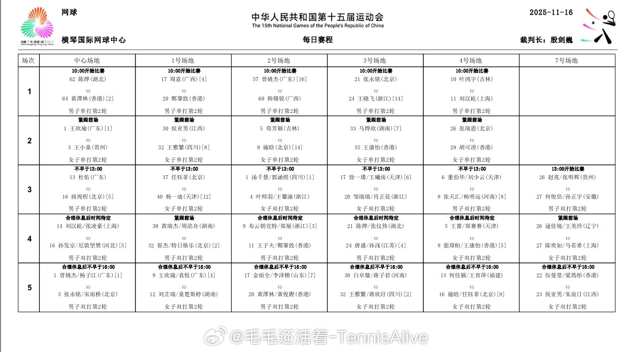 【11.16日比赛赛程】年终决赛10:00黄泽林vs陈烨10:00周意vs郑肇致11:30王欣瑜vs王小童11:30王雅繁vs侯亚男13:00商竣程vs杜佑1:00阿尔卡拉斯vs辛纳