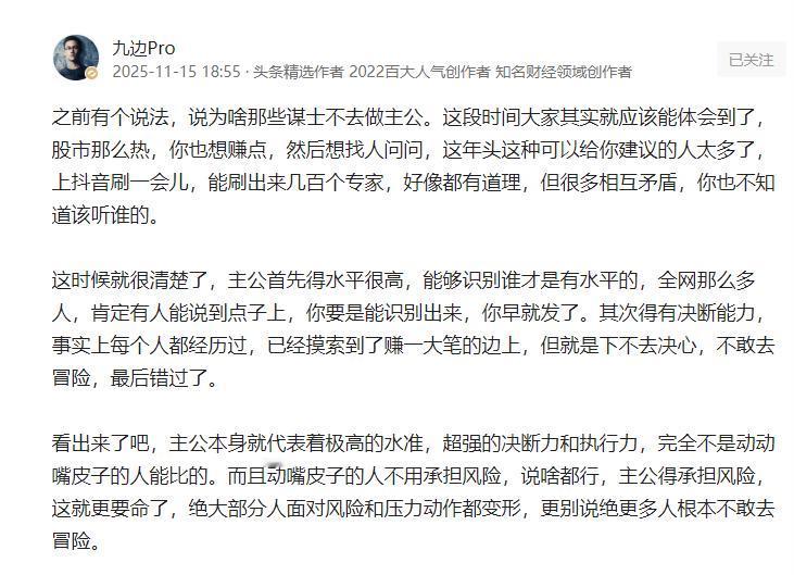 头条大V“九边”这篇微头条,写得实在是太好了,我非常喜欢。 小的时候,看电影电视剧的时候,感觉身边的谋士那么厉害,主公没有谋士的智慧,为何谋士自己不当主公呢?真是太可惜了。 长大以后才发现,主公就是主公,主公才是比谋士厉害的存在。 特别是入了股市以后,更是发现,自己就是主公了。 你刷抖音,刷头条,股市里各种信息、各种观念扑面而来,大家说的都挺有道理的,当然,里面一定有说对的,也有说错的,但是哪个是对的,哪个是错的,有分辨信息的能力,就是一件不简单的事情。 比如,有人说做T好,有人说不做好,有人说要做仓位管理,有人说不做,重中公司就一把梭哈,敢于重仓才能赚大钱,大家说的都有道理。 所有的对错,行情走出来一看,都是很简单的。 但是在事中,看以后还没有发生的事情,真的非常非常的难,不是一般的难。 主公每做一个选择,都要承担相应的代价,而谋士说对也好,说错也罢,不用负责任的,不用承担相应的后果。 当年刘邦起义的时候,大家都推举他当领头人,不是大家认为他能力有多强,而是当领头的,如果失败了,就会陷入万劫不复之地,别人可能说是被他鼓动的,刘邦就要承担所有的责任。 我们都是普通人,在面对巨大压力的时候,每个人的选择都会变形,事后诸葛亮,都是简单的。 对此,大家怎么看,欢迎留言评论,谢谢大家。