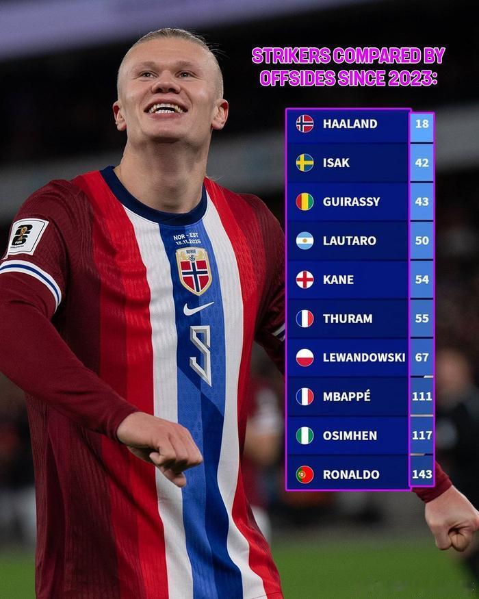 顶级前锋越位榜:C罗143次居首,姆巴佩111次第二 🇳🇴 哈兰德:18 次 🇸🇪 伊萨克:42 次 🇬🇳 吉拉西:43 次 🇦🇷 劳塔罗:50 次 🏴 凯恩:54 次 🇫🇷 图拉姆:55 次 🇵🇱 莱万:67 次 🇫🇷 姆巴佩:111 次 🇳🇬 奥斯梅恩:117 次 🇵🇹 C罗:143 次
