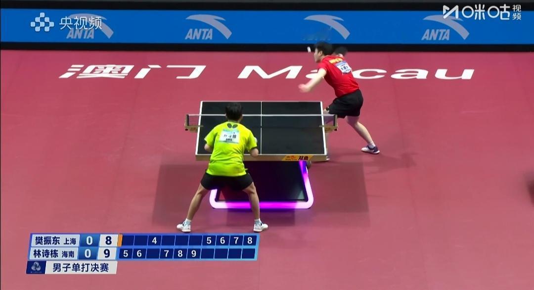 上海樊振东给海南林诗栋上了第一堂大师课! 全运会乒乓球男子单决赛 樊振东(上海)Vs林诗栋(海南独苗) 第一局3平后,小石头前三板发动更快,9:4领先! 可是上海小胖狠狠地给小石头回击! 小胖连得7分,11:9拿下第一局! 樊大师给小弟上了一堂最深刻的一课