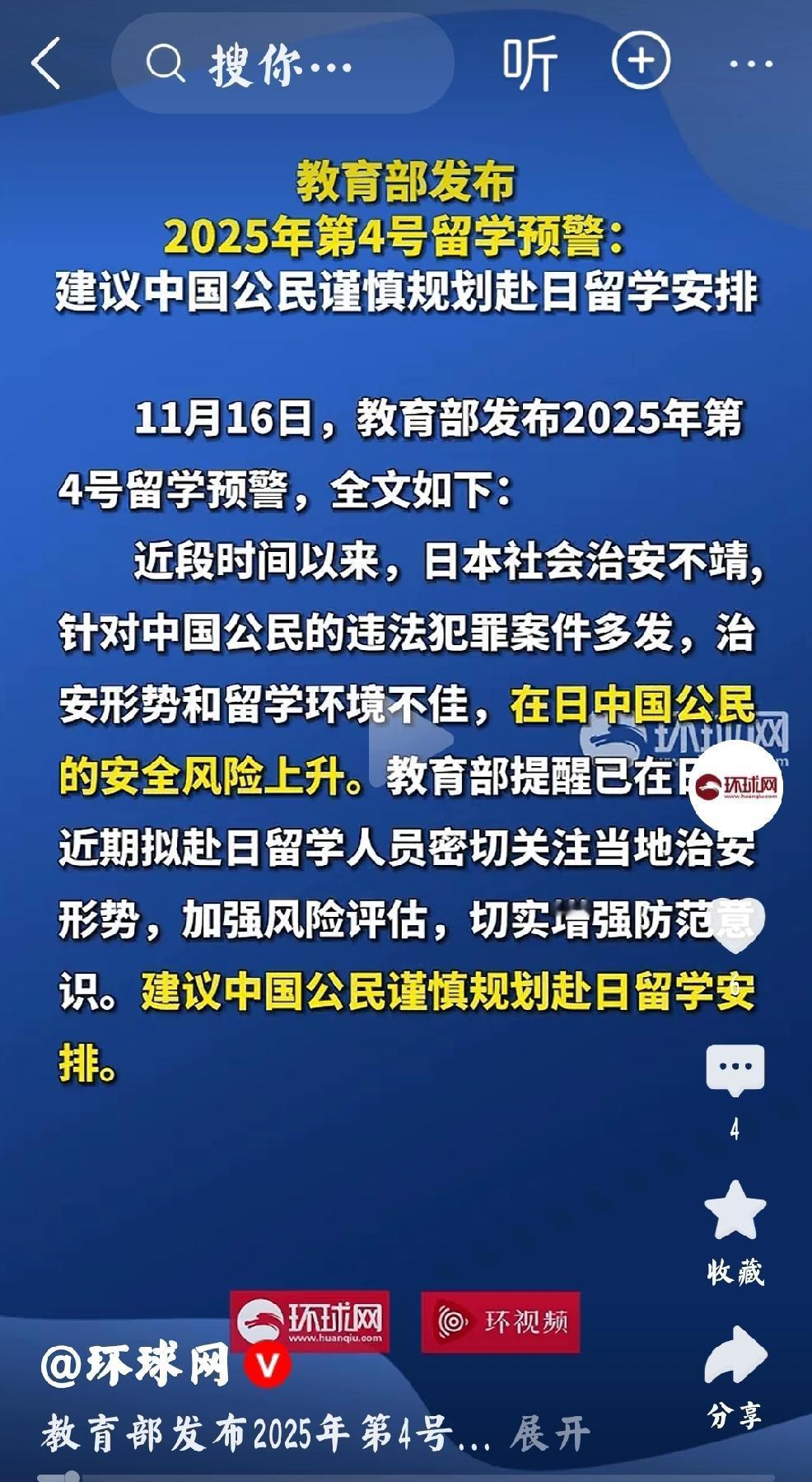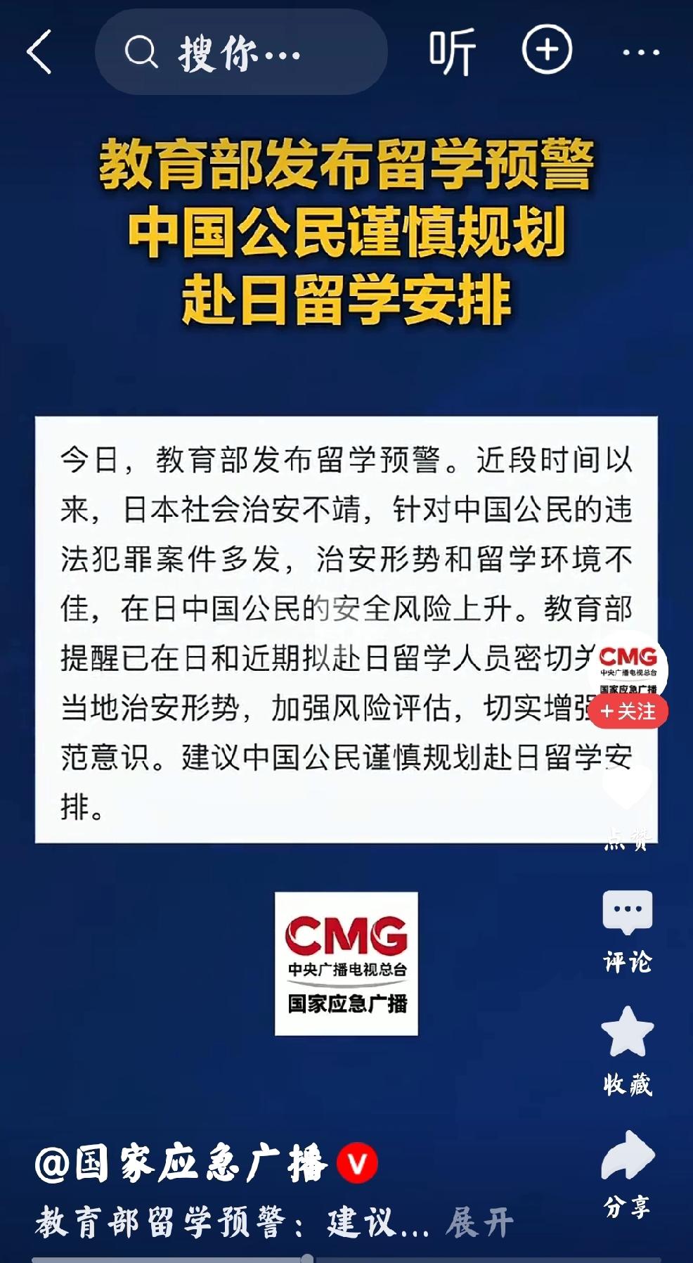 好一招连环计 个人观点:渴望中的中国人民解放军— 陆军部队,作出应对日本的反应。 大出意料之外的是:中国教育部提醒已在日和近期拟赴日留学人员,留学预警通知,建议中国公民谨慎规划赴日留学安排。 个人认为,国家打出的一系列组合拳,只是铺垫,不能够KO日本,远远没有达到将日本去军事化的程度。