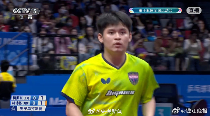 【祝贺!】 第十五届全运会乒乓球男单金牌赛, 4-1(11-9、8-11、11-5、11-3、11-4)战胜 ,获得金牌;林诗栋获得银牌。这是樊振东第四次参加全运会,共夺得6枚金牌。点赞!(央视新闻)