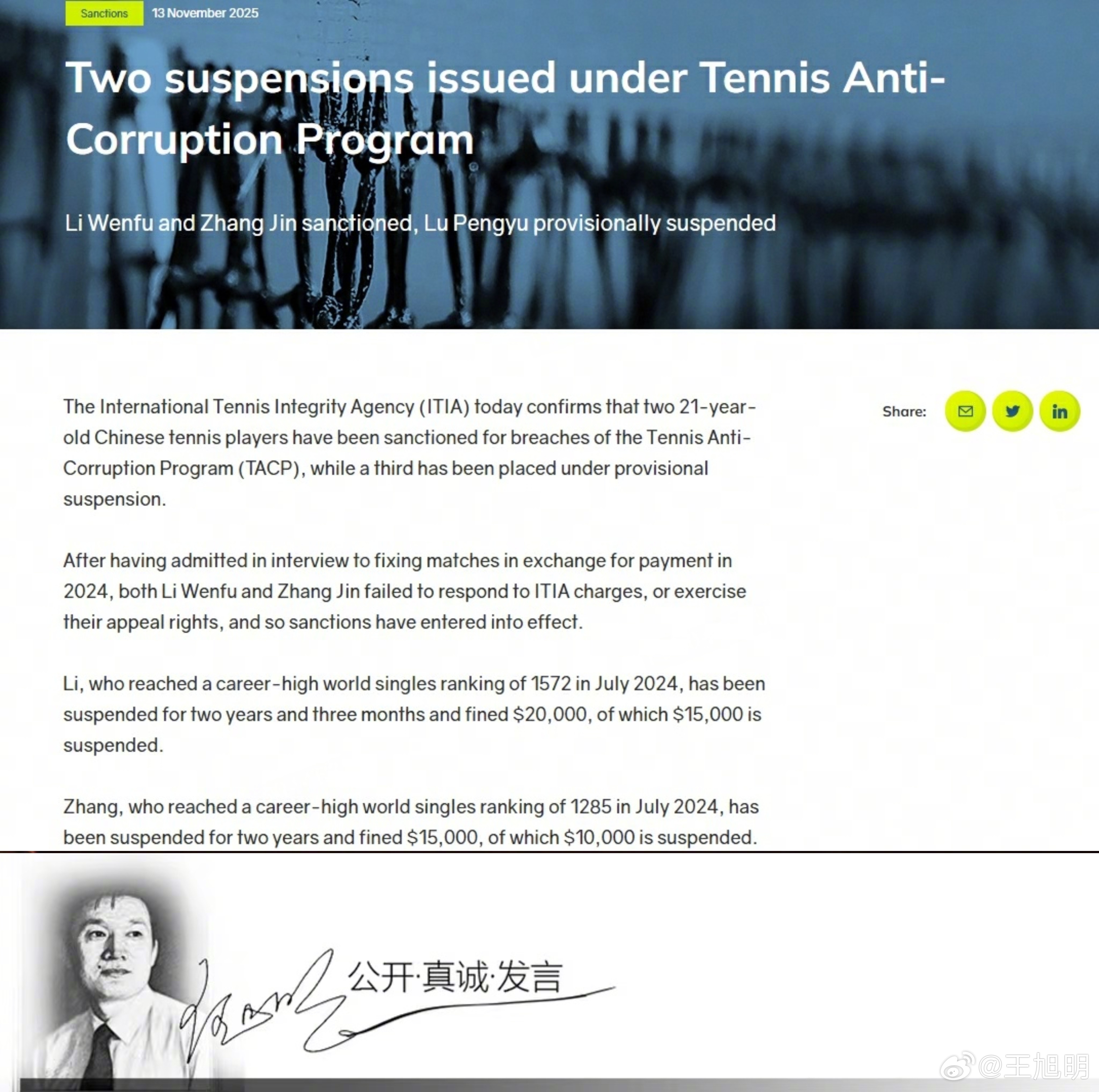 据报道,国际网球诚信机构(ITIA)公布处罚决定:中国网球选手李文夫、张瑾因操纵比赛牟利被处以禁赛和罚款,选手陆鹏宇因违反反腐败规定被临时停赛。据称21岁的网球选手李文夫与张瑾在2024年的调查中坦言,此前为获取报酬参与了比赛操纵;23岁的陆鹏宇在今年广州挑战赛资格赛中曾打出悬殊比分,首盘仅得7分、次盘仅得3分,双蛋告负的表现引发外界对比赛真实性的疑虑,目前因涉嫌违反《网球反腐败计划》(TACP)被临时停赛。据了解作为维护职业网球诚信的独立机构,ITIA表示此类制裁旨在“推动并守护职业网球赛事的诚信”。另一则报道是,中央美术学院城市设计学院日前发布情况通报称,该院一学生完成的一年级《设计思维与表达 2》课程作业19幅构图中的两幅涉嫌未经作者许可,借用他人创作元素,情况属实。目前学生奖学金评审经审查决定该生奖学金公示不予通过。 类似事件时有发生,当然不仅仅给中国年轻球员和年轻学生的职业发展敲响警钟,也给所有在事业上拼搏的人们敲响警钟,而教育最该做的就是:千教万教教人求真,千学万学学做真人。 别以为这是俗话、废话和值不得什么的话,然而确是教育,乃至整个人生的真谛。当下流行各种心灵鸡汤,什么幸福呀、快乐呀,什么意念呀、体验呀,哪有那么复杂?我看了些点击过万的短视频,说的基本上都是隔靴搔痒的、把简单生活整复杂的话,我看目的就是为了图流量、为了赚钱。 真正的教育和教育者的表达永远是简单的,确值得用一生,如有教无类、因材施教,再如这句千教万教教人求真,千学万学学做真人,等等。