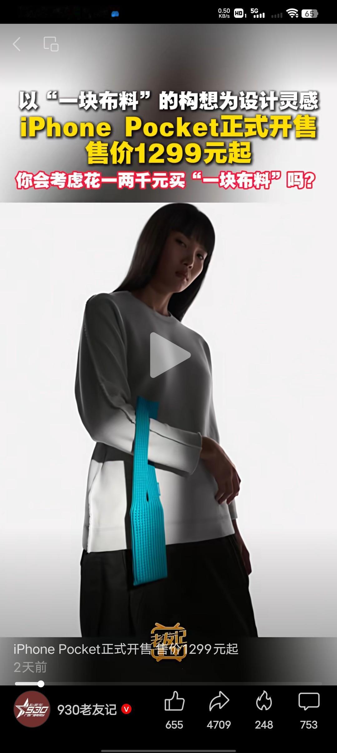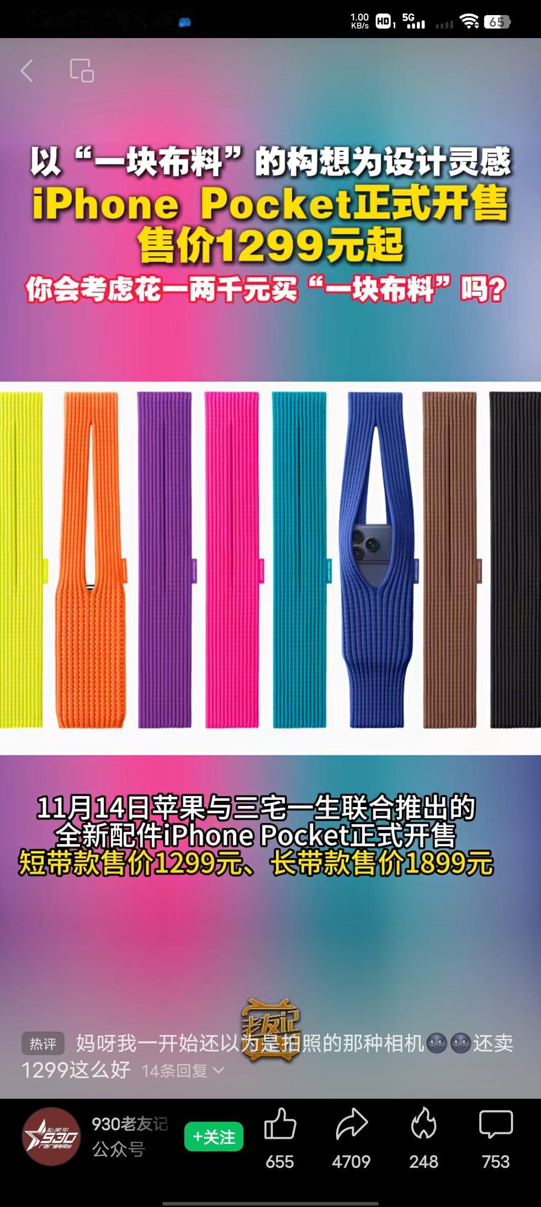 苹果从来不坑穷人,1299元买块布,你没听错,苹果从来不让人失望。 11月14日苹果与三宅一生联和推出全新,以一块布料为灵感iPhonePocket正式开售,短带款售价1299元,长带款售价1899元。 这次巴黎世家是遇到对手了,苹果还是挺人性化,从来不挣穷人的钱。有人说,我媳妇的一条秋裤能改两个,还有人说,咱没钱,有线有针自己动手更好!