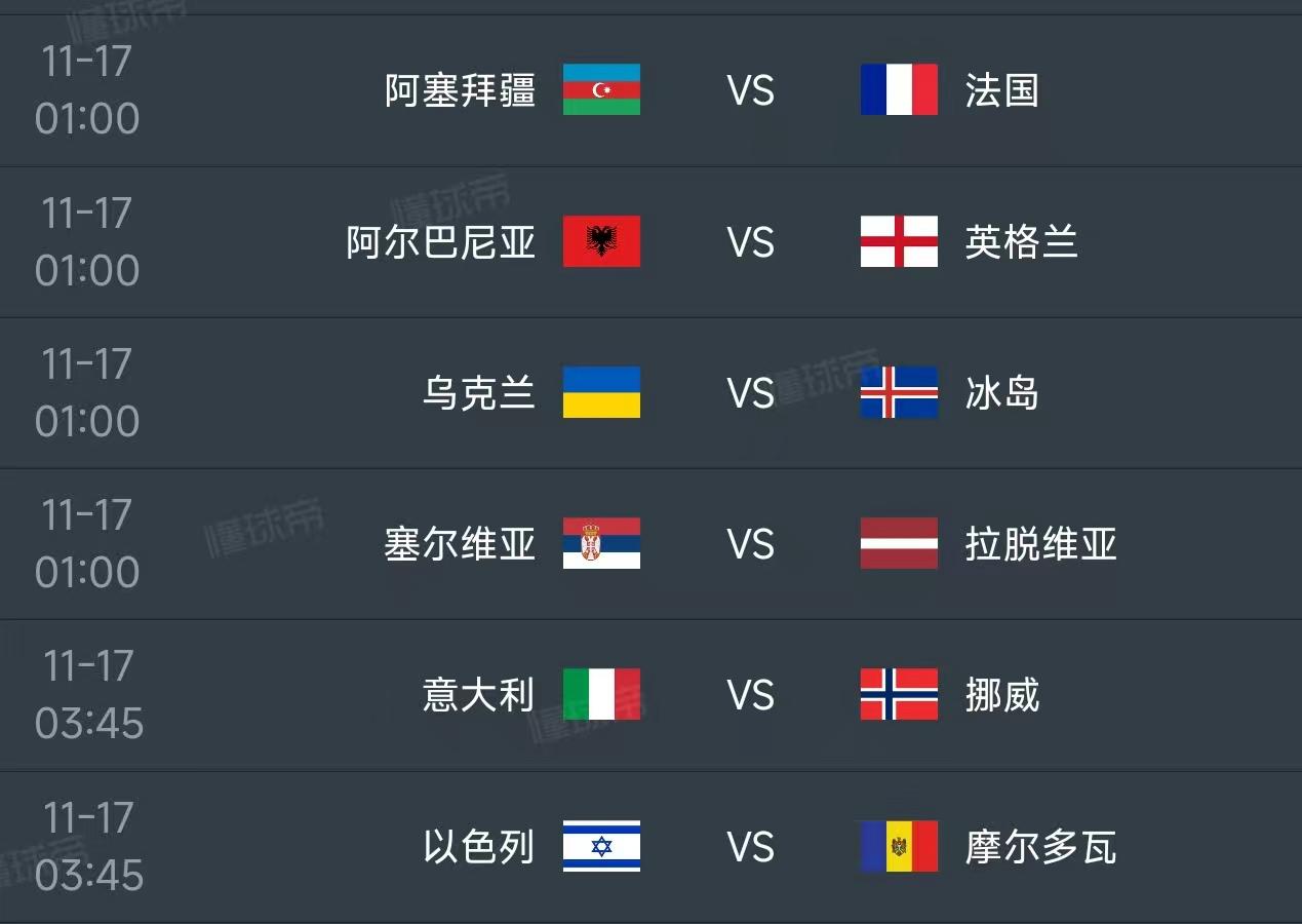 北京时间11月17日,欧洲区世预赛小组赛第10轮部分赛程如下: 01:00,D组,阿塞拜疆VS法国:法国4胜1平积13分已经提前出线,阿塞拜疆是弱旅难求一胜 同组的乌克兰VS冰岛,两队目前都是7分,冰岛净胜球力压乌克兰,只需要打平就能拿到附加赛 K组:阿尔巴尼亚VS英格兰:三狮军团豪取了7连胜,而且一球未丢,期待完美收官 同组塞尔维亚VS拉脱维亚 03:45:I组,意大利VS挪威,意大利落后挪威三分,要想获得小组第一,不仅要全取三分,还需要9个净胜球,这几乎是不可能完成的任务,所以意大利做好踢附加赛的准备。