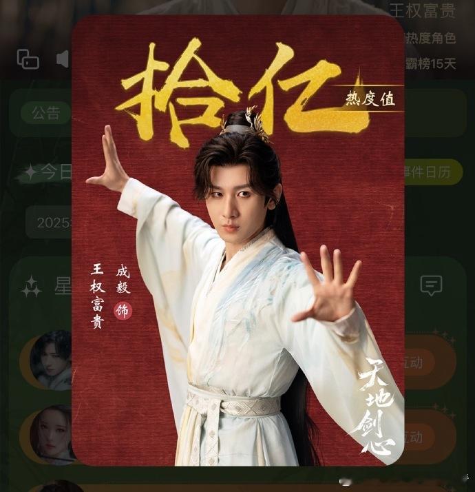 破纪录!成毅《天地剑心》王权富贵热度超 10 亿,拿下爱奇艺角色热度史冠。