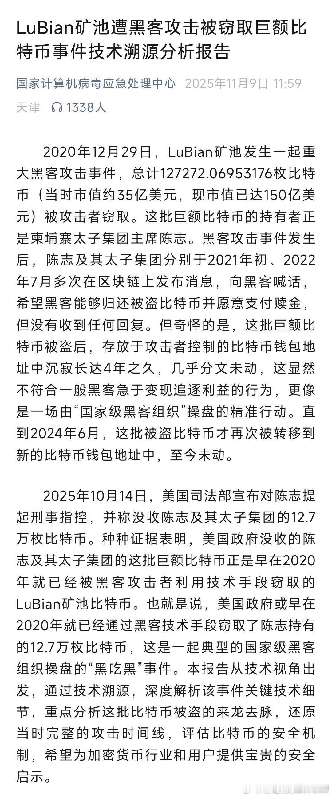 国家计算机病毒应急处理中心发布LuBian矿池遭黑客攻击被窃取巨额比特币事件技术溯源分析报告。陈志所拥有的资产被没收,这是罪有应得、咎由自取的报复,而美国通过黑客技术手段窃取了陈志持有的12.7万枚比特币,这么做只不过是黑吃黑罢了。 桂哥评:问题是,比特币都能被黑客窃取,那还有什么安全可言呢?美国国家级黑客,能黑12.7万枚比特币,那想黑你的还不容易?到时候,钱没了,你叫天天不应,叫地地不灵。