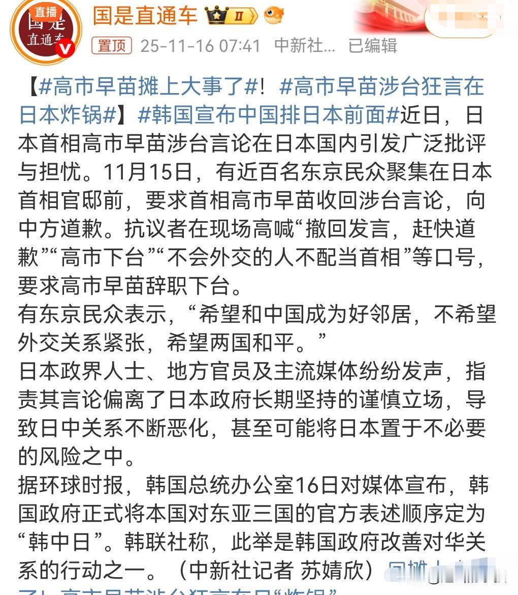 无知的高市早苗摊上事儿了。 近日,因为涉台挑衅言论,饱受中日有识之士的痛批。 11月16日,韩国宣布中国排日本前面。 这也是向中国释放善意的表现。 这个我倒不意外,毕竟日本对韩国也是做出过伤天害理的事情。 那肯定是要把中国排日本前面的。 此前有民众集会要求高市早苗下台,民众认为不会搞外交的人不配当首相。