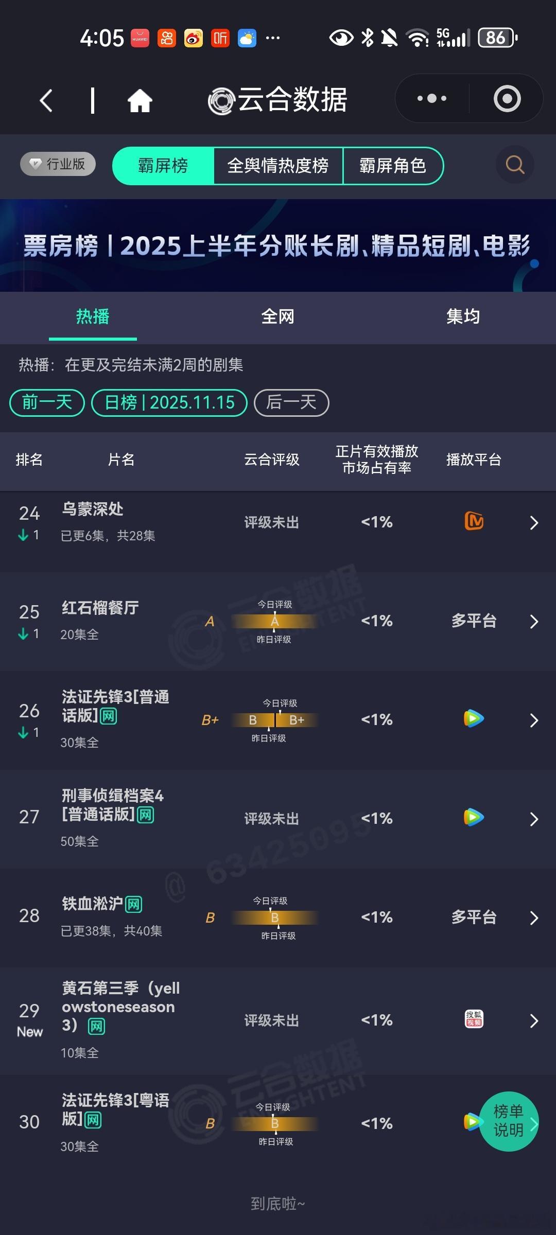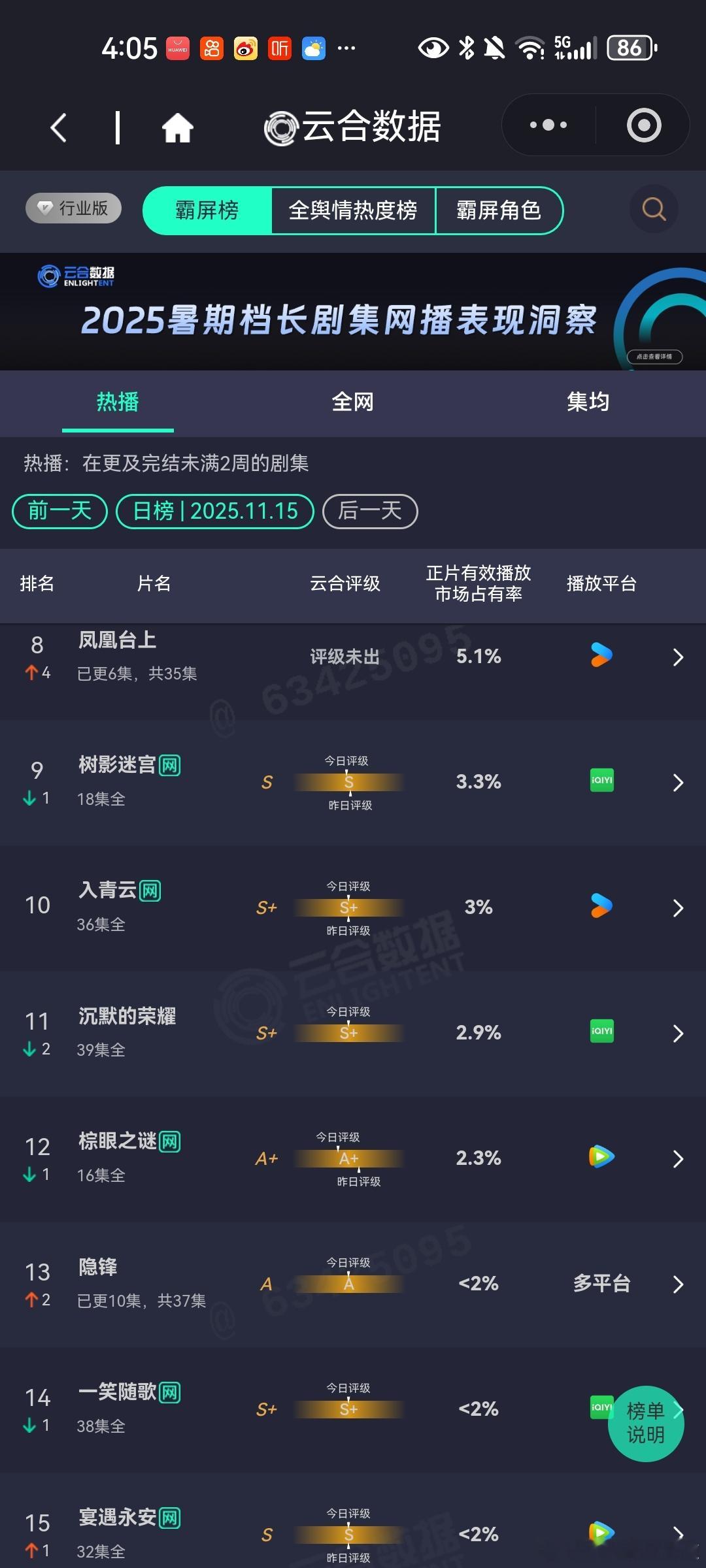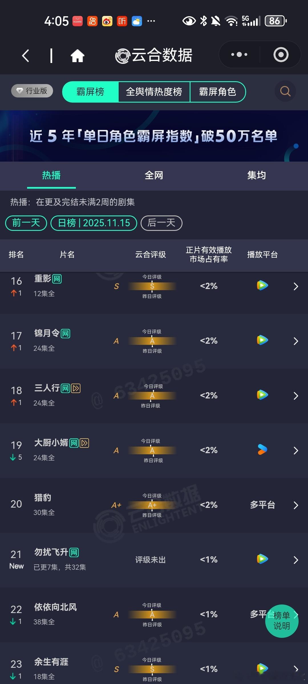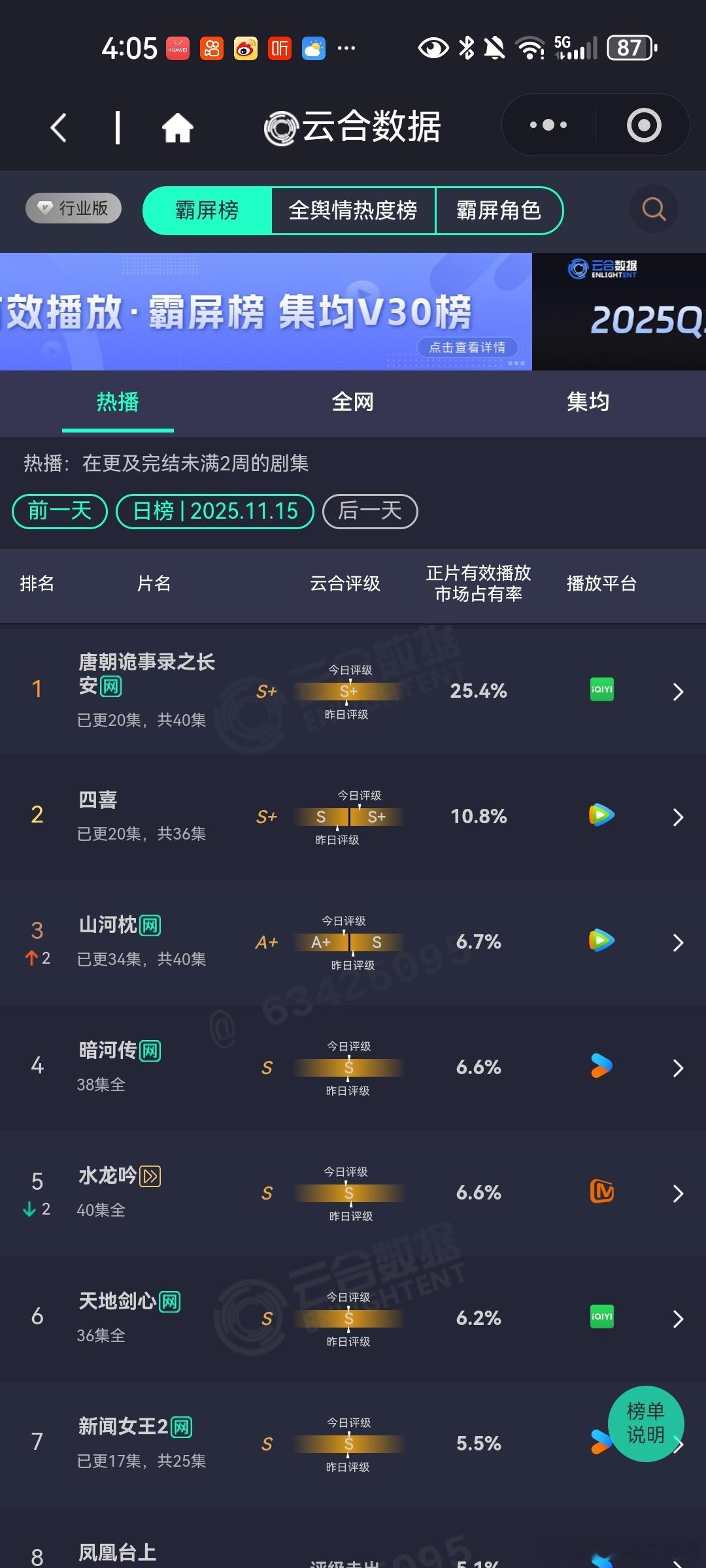 11月15日云合播放占比 唐朝诡事录之长安25.4%微涨四喜10.8%播出S+级了。山河枕6.7%又成A级了,唉暗河传6.6%水龙吟6.6%天地剑心6.2%阵势最大,效果最差凤凰台上5.1%翻倍成功,很不错哦。