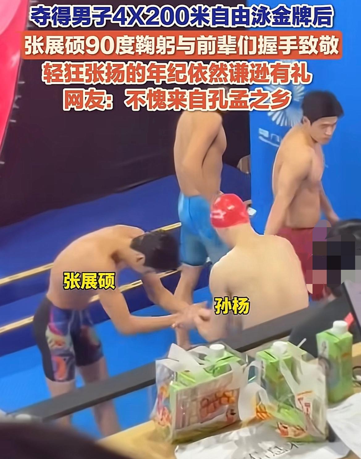 一个细节可以看出,青岛小孩哥张展硕会走得很远: 男子4X200游泳接力赛后,张展硕与汪顺、孙杨、潘展乐三位前辈在场边握手,小孩哥的表现赢得一片称赞。 只见他跟三位前辈一边握手,一边毕恭毕敬地鞠躬致敬,那躬鞠得得有90度了,可真够费腰的。 大家纷纷为张展硕点赞,不愧是礼仪之邦的孩子,太有礼貌了!18岁正是年少轻狂的年纪,可是张同学只在赛场上张狂,赛后则成了谦虚低调的乖小孩。 有过人的天赋,有肯吃苦的精神,还不骄不躁、谦虚谨慎,张展硕,未来的路会越走越好!越走越远!