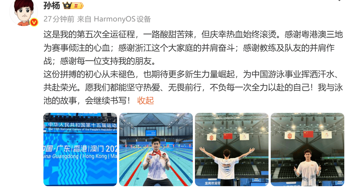 孙杨在社媒上这样写道:“这是我的第五次全运征程,一路酸甜苦辣,但庆幸热血始终滚烫。感谢粤港澳三地为赛事倾注的心血;感谢浙江这个大家庭的并肩奋斗;感谢教练及队友的并肩作战;感谢每一位支持我的朋友。”