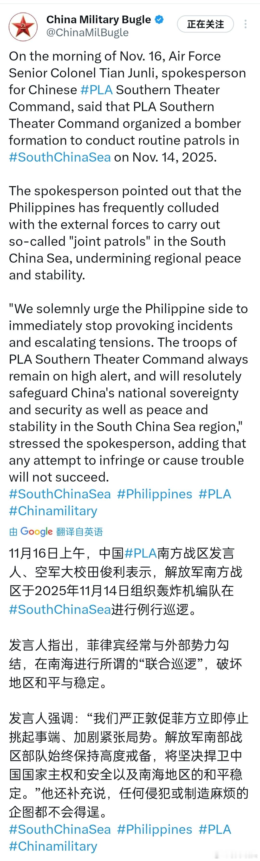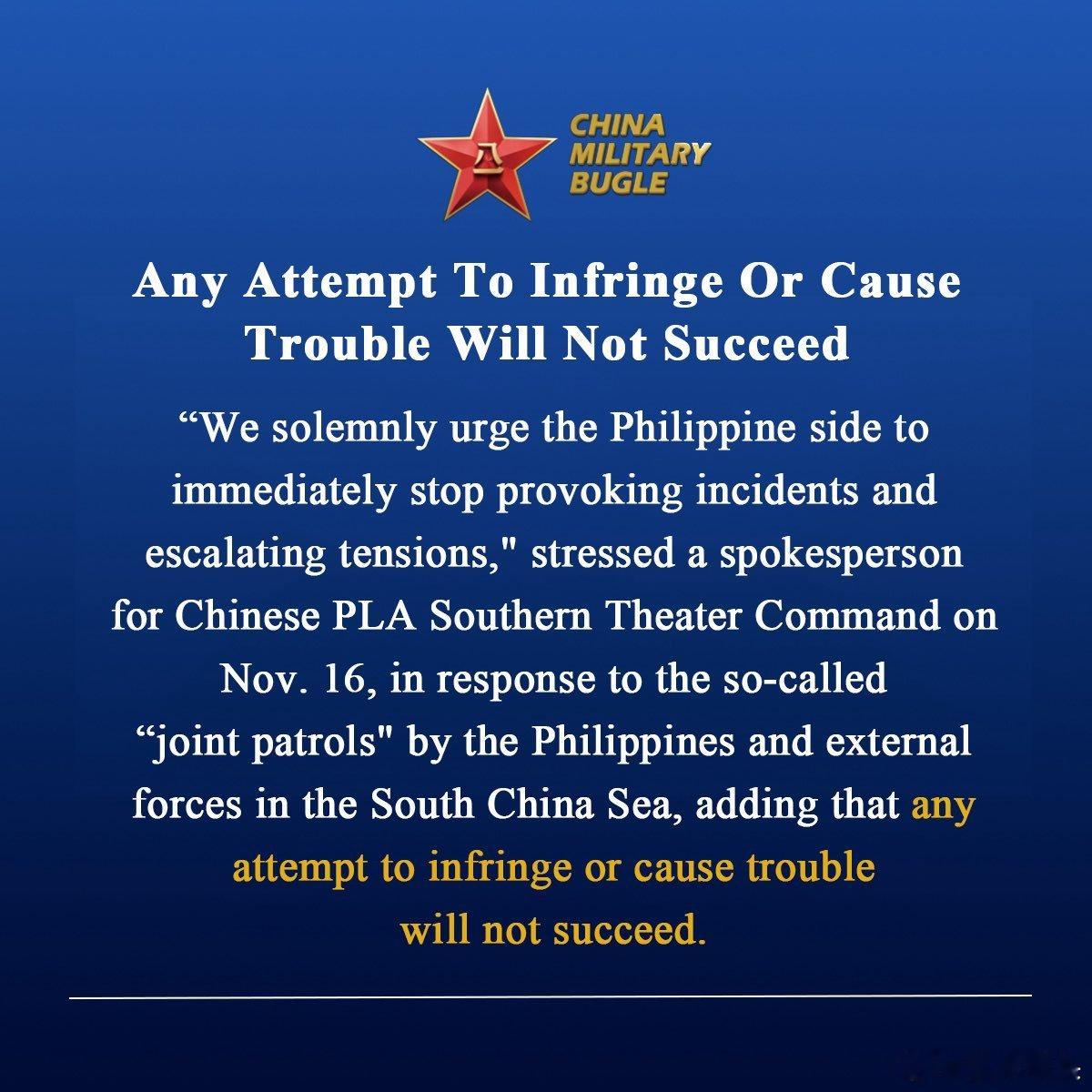 我们在南海的日常巡逻不能停。对于菲猴已经不能只是简单地谴责几句了,需要有更有力的各种制裁措施。菲猴国内都烂成这样了,天灾人祸不断,不想着把国内搞好,还想着到处搞事,可以说是死性不改,冥顽不灵。