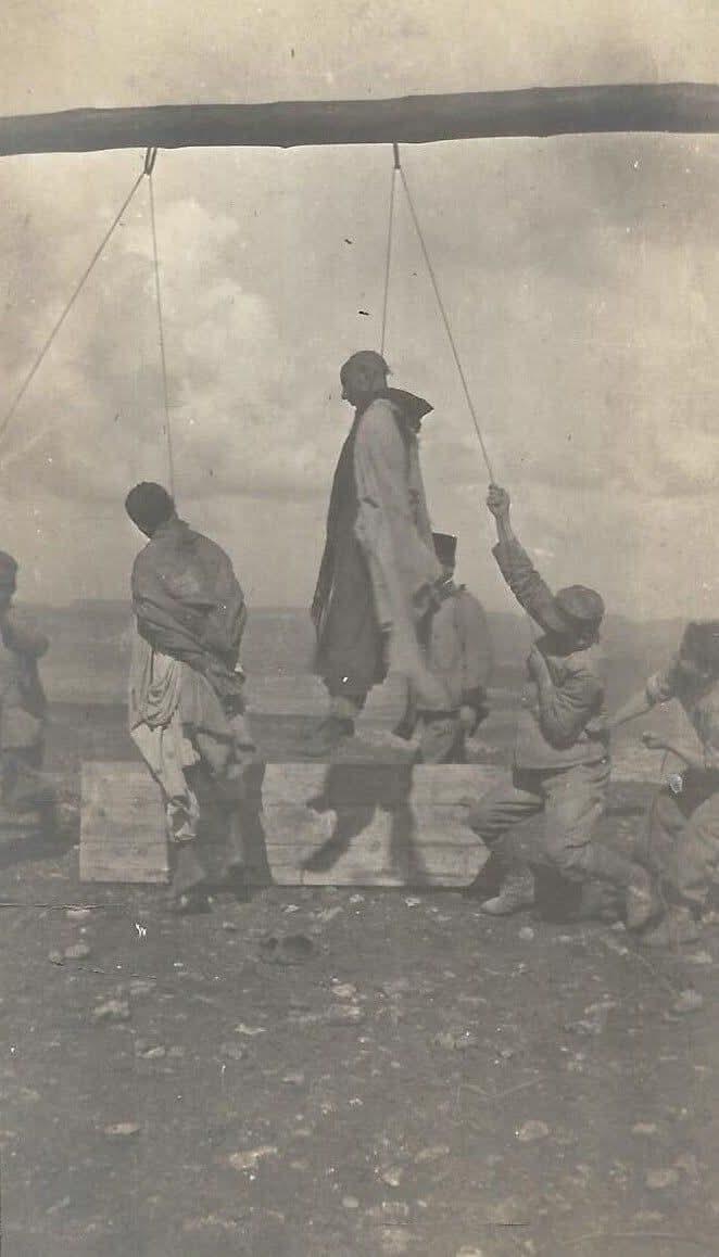 The moment of the execution of Libyan mujahideen at the hands of soldiers of the Italian Crusader Army near the city of Al-Beida in 1923 AD. 这张照片似乎确系意大利占领利比亚时期所拍摄,意大利档案馆记录了在第二次意塞努西战争(1923-1932)期间,利比亚圣战者遭到类似处决的事件。历史背景也印证了在贝达附近发生此类事件,且没有证据表明照片系伪造。确切日期可能是1911年而非1923年,但这反映了利比亚抵抗运动的真实情况。