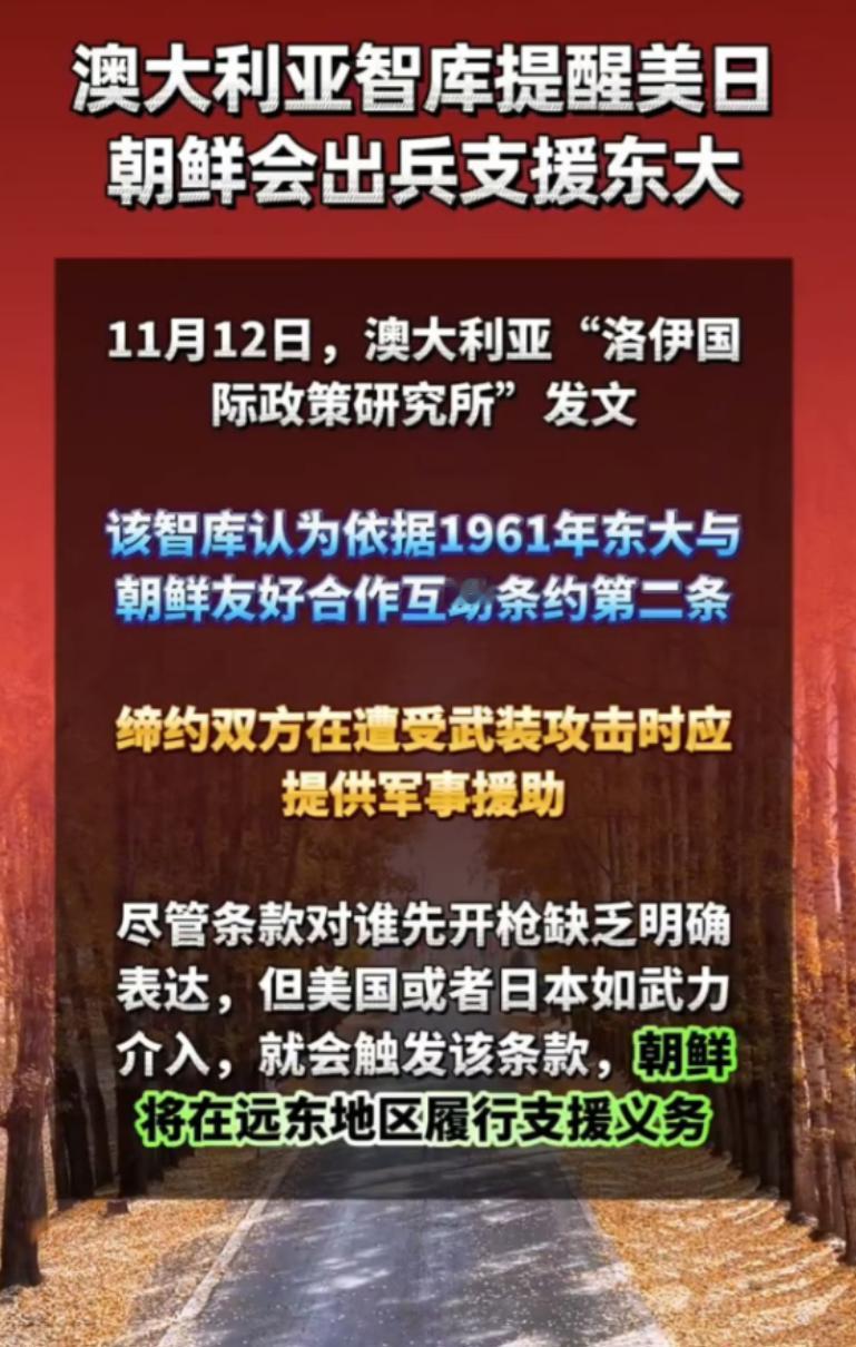 澳大利亚智库提醒:如日本武力介入台海,朝鲜必参战!日本武力介入将会自动触发《中朝友好合作互助条约》中的共同防御条款。如果日本出兵钓鱼岛或台湾,直接攻击中国领土,构成对中国的 "武装进攻",中国因此进入战争状态,理论上会触发条约。朝鲜官方曾明确表态:一旦中国军队与日本交战,朝鲜将站在中国一边,对日 "狠狠地予以痛击",朝鲜将会像出兵援俄一样出兵对日作战,支援东方大国。 别觉得 “武装进攻” 是个多玄乎的词,好像非得日本自卫队架着枪炮冲过来才算数,其实没那么复杂 —— 要是日本敢往台湾送那些能直接造成实际伤害的攻击性武器,或者派自卫队打着 “护航” 的幌子往台海掺和,甚至在钓鱼岛跟中国这边的力量起了冲突、动了手,这些事儿都算踩了 “武装进攻” 的红线。 真到这一步,中国进入战争状态就是顺理成章的事,而朝鲜参战就不是 “帮盟友搭把手” 那么简单了,是条约里白纸黑字写着的法定义务,想躲都躲不掉,根本没什么讨价还价的余地。 朝鲜对这事儿的态度从来没含糊过,官方早把话撂在明面上了。之前不管是台海这边有动静,还是日本在周边搞小动作,朝鲜都明确说过,只要中国军队跟日本真刀真枪打起来,他们肯定站在中国这边,得对着日本 “狠狠地予以痛击”。 而且看之前朝鲜出兵支援俄罗斯的那股劲儿,就知道他们不是光说不练的 —— 真到了该出手的时候,支援的力度、投入的力量,只会比援俄的时候更实在,绝不会掉链子。 核心还是那纸《中朝友好合作互助条约》,这玩意儿不是几十年前签了就过期的老文件,一直都有法律效力,尤其是里面的共同防御条款,就是道硬杠杠。 条约里写得清楚,只要中朝任何一方遭到其他国家的武装进攻,另一方就得尽全力提供包括军事在内的援助。 日本要是真敢对中国领土动歪心思、搞武力介入,那就是把自己直接架到了这个条款的跟前,到时候朝鲜出兵就是名正言顺履行义务,谁也挑不出理来。 日本要是这会儿没数,觉得背后有美国撑着就敢瞎折腾,那可真是没算明白账。先不说中国现在的海空力量早就今非昔比,海军舰队常年在西太平洋巡航,空军的先进战机随时能升空,火箭军的精准打击能力更是摆在那儿;真把朝鲜卷进来,日本面对的就不是单一对手了,而是两个拧成一股绳的盟友。 朝鲜那边的导弹部队威慑力不用多说,真要动手,日本本土的军事基地、重要工业设施都得掂量掂量风险,更别说还要分兵应对台海和朝鲜半岛的两线压力,这吃力不讨好的事儿,稍微有点脑子都知道划不来。 澳大利亚那些智库能这么说,也不是瞎猜的 —— 他们研究地缘政治这么多年,对各国的条约约束、立场态度摸得门儿清,肯定是把前前后后的逻辑都捋顺了才敢下这结论。 说白了就是给日本提个醒:别跟着美国在台海、钓鱼岛这些地方瞎晃悠,这些都是中国的核心利益,碰一下都不行。真要是脑子发热闯了祸,把朝鲜也拖进来,最后只会是搬起石头砸自己的脚,没半点好处。 之前朝鲜驻华大使也写过文章,明明白白说 “中华大地上始终只有一个中国”,坚决支持中国搞祖国统一,这态度不是装出来的,是几十年的交情和条约的约束摆在那儿。 日本要是听不懂这种劝告,非得往火坑里跳,那等待它的绝不会是什么好下场 —— 北边有朝鲜的火力压着,东边有中国的防线锁死,到时候就算想找帮手,也没人能真的帮它解套。 现在的局势其实很清楚,台海和钓鱼岛的红线碰不得,《中朝友好合作互助条约》的效力也容不得质疑。日本要是真敢冒天下之大不韪搞武力介入,朝鲜参战就不是选择题,而是必答题。 到时候不光是军事上要面对双重压力,国际上的舆论、经济上的损失也得自己扛着,这种赔本赚吆喝的买卖,真不知道日本有没有勇气做。 说到底,台海问题是中国的内政,轮不到外人指手画脚,更轮不到日本来动武介入。朝鲜的立场已经摆得明明白白,条约的约束也实实在在,这就是最硬的威慑。 日本要是识相,就赶紧收收那些不该有的心思,别最后把自己玩进去,到时候哭都没地方哭 —— 毕竟真到了那一步,没人会帮它收拾烂摊子,所有后果都得自己扛。