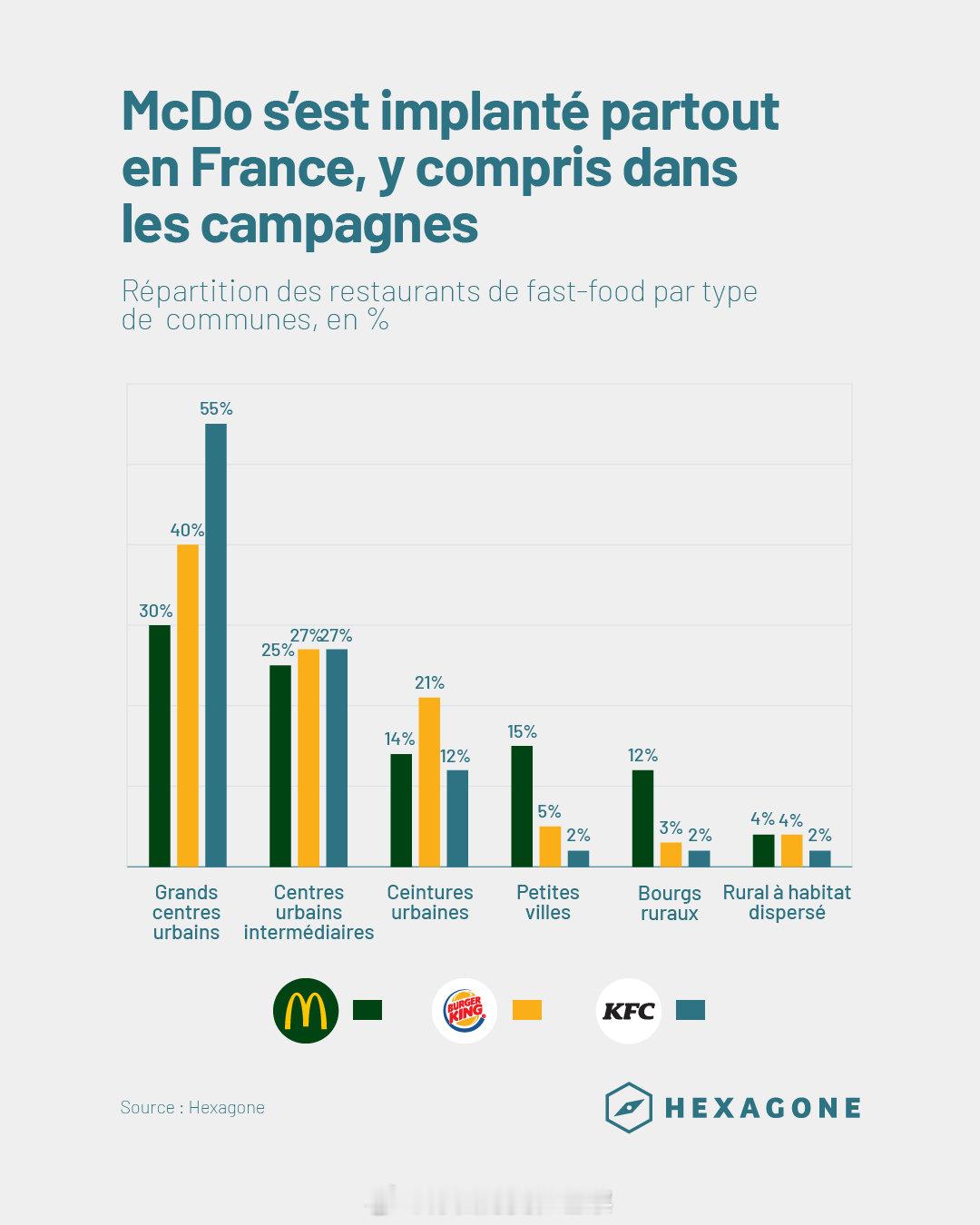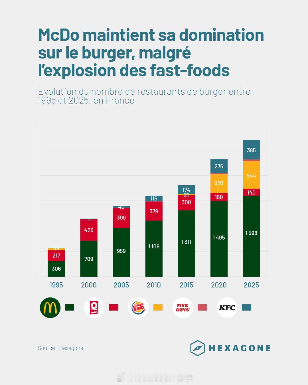 麦当劳如何成为一个法国品牌过去三十年,法国汉堡连锁店数量从1995年的562家增长到2025年的2707家。麦当劳从306家扩张到1598家,占市场近60%,增长稳定。竞争对手如肯德基十年内增长122%,而麦当劳仅增长22%,但其覆盖范围更广,16%门店位于农村地区,而竞争对手多集中在大城市。凭借远超竞争对手的餐厅数量,麦当劳还以地域分布更均衡而脱颖而出。它是唯一一个覆盖所有类型地区的品牌,包括农村地区——16%的麦当劳餐厅位于农村地区,而汉堡王或肯德基则主要集中在大城市及其周边地区(肯德基在大城市及周边地区的餐厅比例高达55%)。尽管汉堡王最近也开始进军中型城市。经过长期发展,麦当劳已成为法国人生活中的一个基础品牌。年轻人与麦当劳的关系调查显示,51%的18-35岁法国年轻人每月至少光顾一次麦当劳,22%每月多次光顾。56%年轻人在8岁前由父母带领首次接触麦当劳。麦当劳已成为重要社交场所:40%的人在此庆祝生日,46%庆祝拿到驾照,22%选择此处作为首次约会地点。此外,49%年轻人去麦当劳仅为购买冰淇淋或咖啡,39%用于朋友聚会,尤其是在缺乏社交场所的农村或郊区。农村扩张战略麦当劳致力于让每个法国人在20分钟车程内找到一家门店,2021年以来新开的60多家门店中,三分之二位于小城镇或农村。这些门店通常开在交通便利的商业区,有时加剧了城市中心衰落的担忧。目前,45%的法国人生活在有麦当劳的城镇,71%拥有麦当劳的城镇人口少于2.1万。就业与经济影响每家麦当劳餐厅每年创造50-100个就业岗位。11%的法国年轻人曾在麦当劳工作,59%的人身边有在麦当劳工作的朋友。麦当劳门店多开在社会经济条件较差的地区,如失业率较高的城镇,为当地提供就业支持。法国对麦当劳的影响法国市场推动麦当劳进行本土化改革。2009年起,欧洲麦当劳采用绿色标志,强调可持续发展。法国作为麦当劳全球第二大市场,成为创新的试验田,如自动点餐机和本土化菜单等,先在法国测试后再推广到欧洲其他地区。麦当劳已深度融入法国社会,成为文化和经济的重要组成部分。