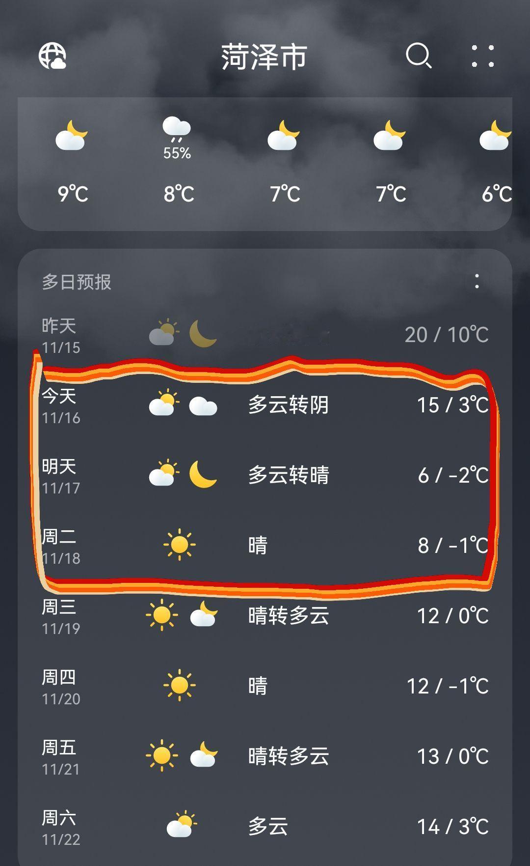 菏泽的天气是: 众里寻他千百度,他想几度就几度![捂脸][捂脸],大家的秋裤准备好没