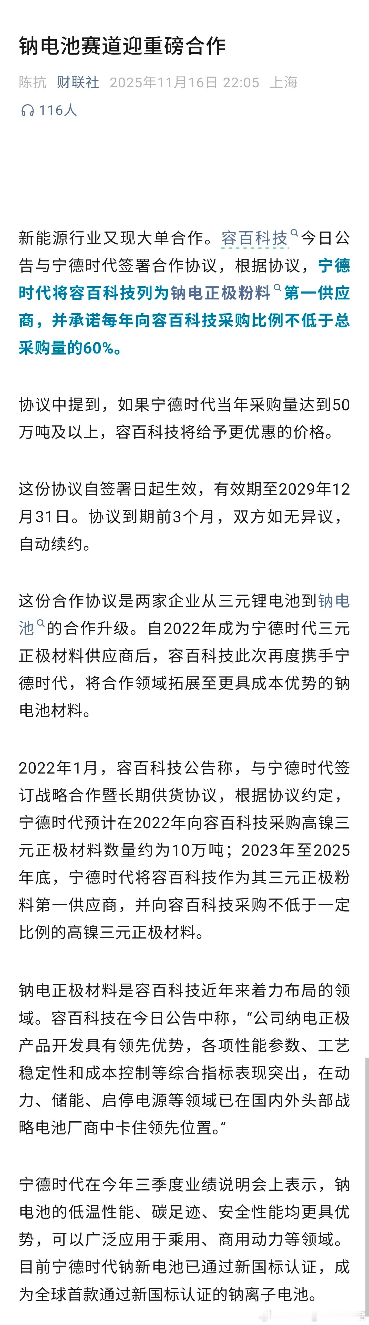 宁德时代与容百科技签订合作协议,钠电池赛道迎来重磅合作