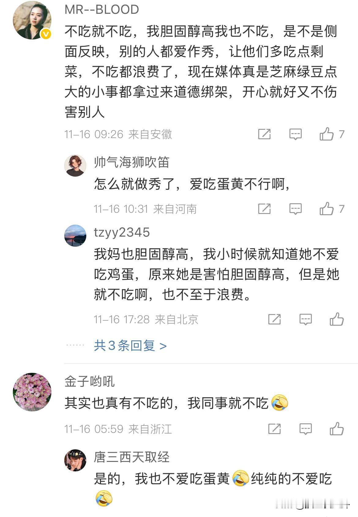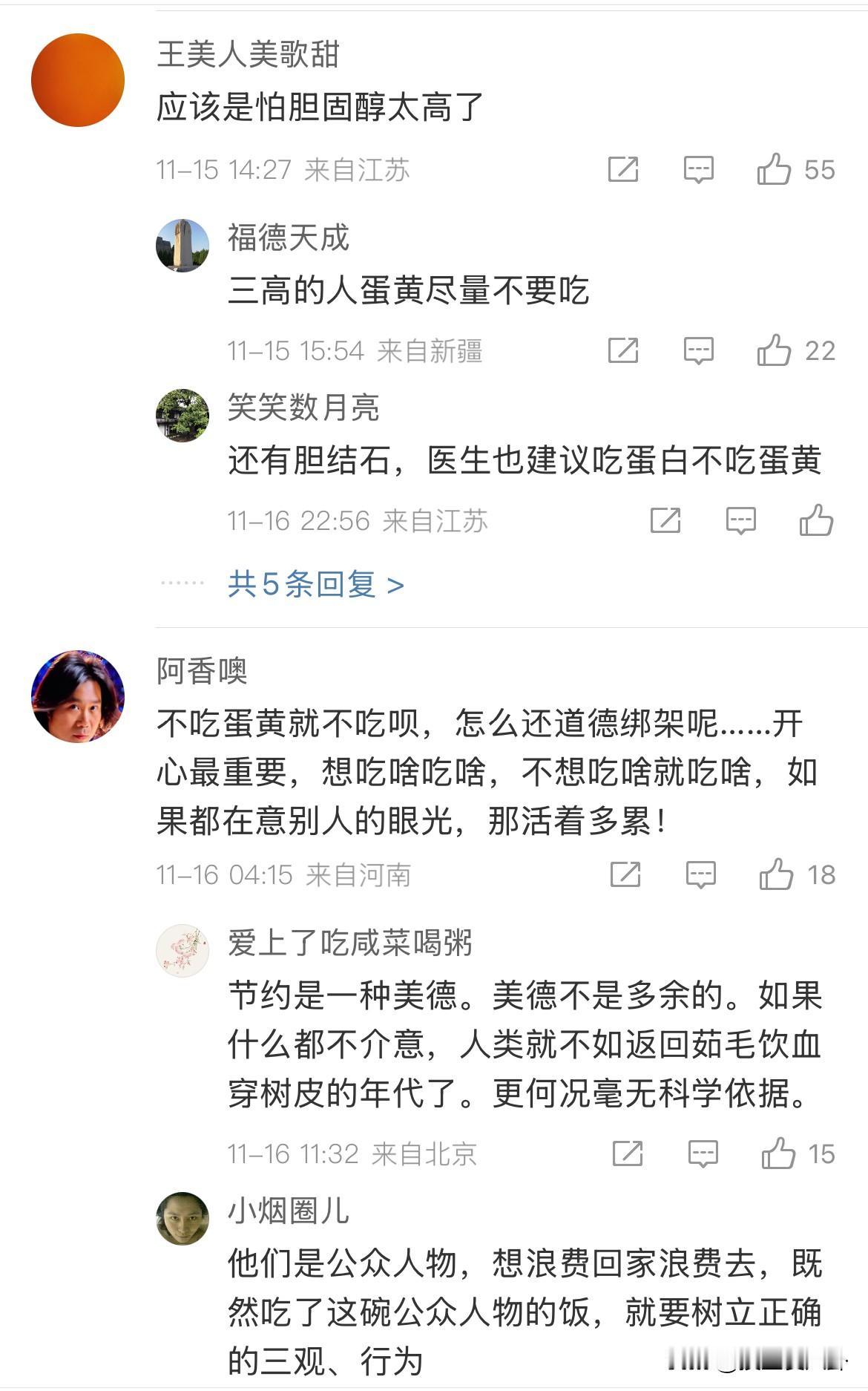 网友们又因为刘嘉玲吵翻天了 这次不是因为生不生孩子 而是因为鸡蛋!在一路繁花里刘嘉玲吃5个鸡蛋却只吃蛋白,不吃蛋黄。 后来还是何赛飞宁静几人把剩下的蛋黄给吃了! 有人觉得刘嘉玲只吃蛋白丢蛋黄,是一种浪费行为! 也有人说蛋黄本来就不好,尤其是对于三高人群和胆结石人群本来就要避免摄入蛋黄。健康第一! 有一些健身人也是只吃蛋白,不吃蛋黄。 不知道刘嘉玲是因为处于健康考虑还是因为口味偏好不吃蛋黄。 刘嘉玲
