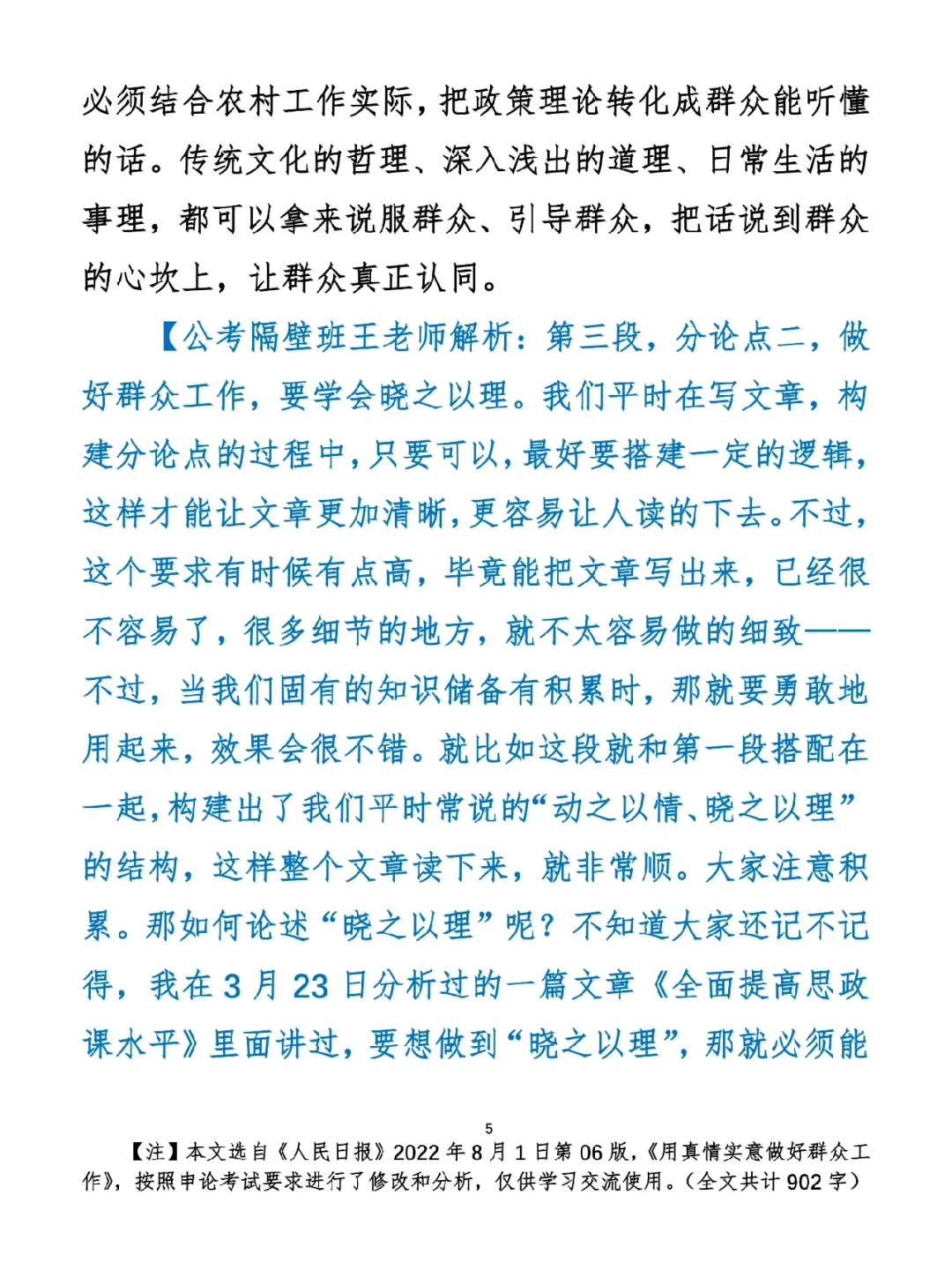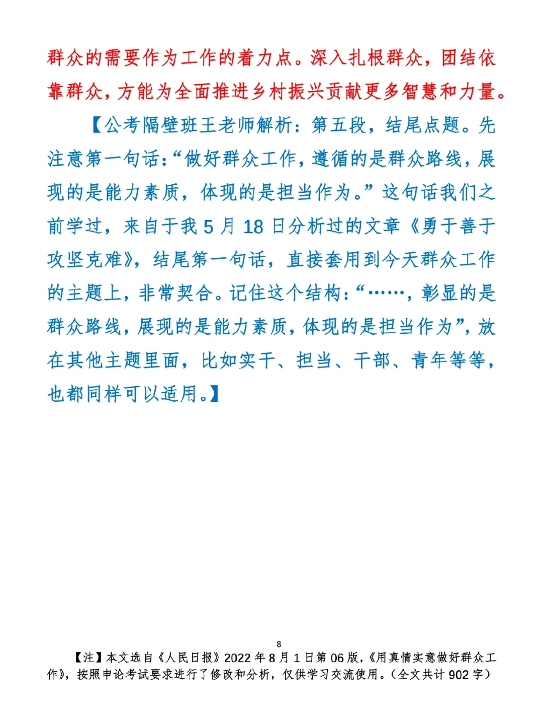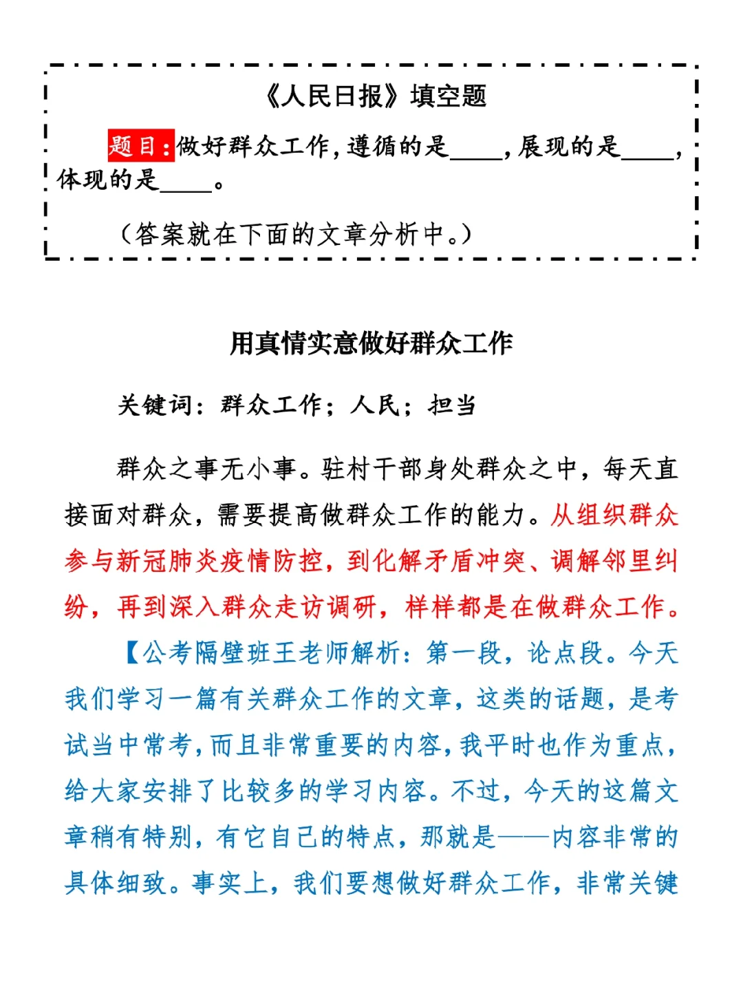 今日打卡作业: 1. 完成填空题 2. 抄写全文红字+划线部分内容 3. 写完后在留言区打卡 ⭐️ ⭐️ ⭐️ ⭐️ ⭐️ ⭐️ 如何抄写:每天的抄写文章以图片形式发在“公考隔壁班王老师”账号,红色字是重点句和结构句,黑色字是正文,蓝色字是解析,大家抄写时不必抄蓝色字。建议先通读全文(包括蓝色解析部分),做到心中有数再开始抄写,效果会更好。 关于文章:抄写文章来源于人民日报,但每篇文章我都根据申论考试要求进行了修改,主要集中在四个方面:一是重写或修改开头、结尾;二是统一段首句句式结构;三是调整段落字数,使文章结构更均衡;四是简化复杂长难句,使之更具可模仿性。每篇文章修改幅度不同,无论修改多少,都是基于申论考试要求,毫无对人民日报文章品评之意。(此处致敬人民日报) 关于解析:我会在文章每段后面加一段蓝色字的解析,是我自己在抄写时的感悟,篇幅时间有限,不能面面俱到,但求重点突出。如果你有其他感悟,也希望能在评论里分享,我们相互学习、共同进步。 ⭐️ ⭐️ ⭐️ ⭐️ ⭐️ ⭐️ 这里是公考隔壁班王老师独创的“每天半小时・申论80分”抄写团,欢迎加入我们!
