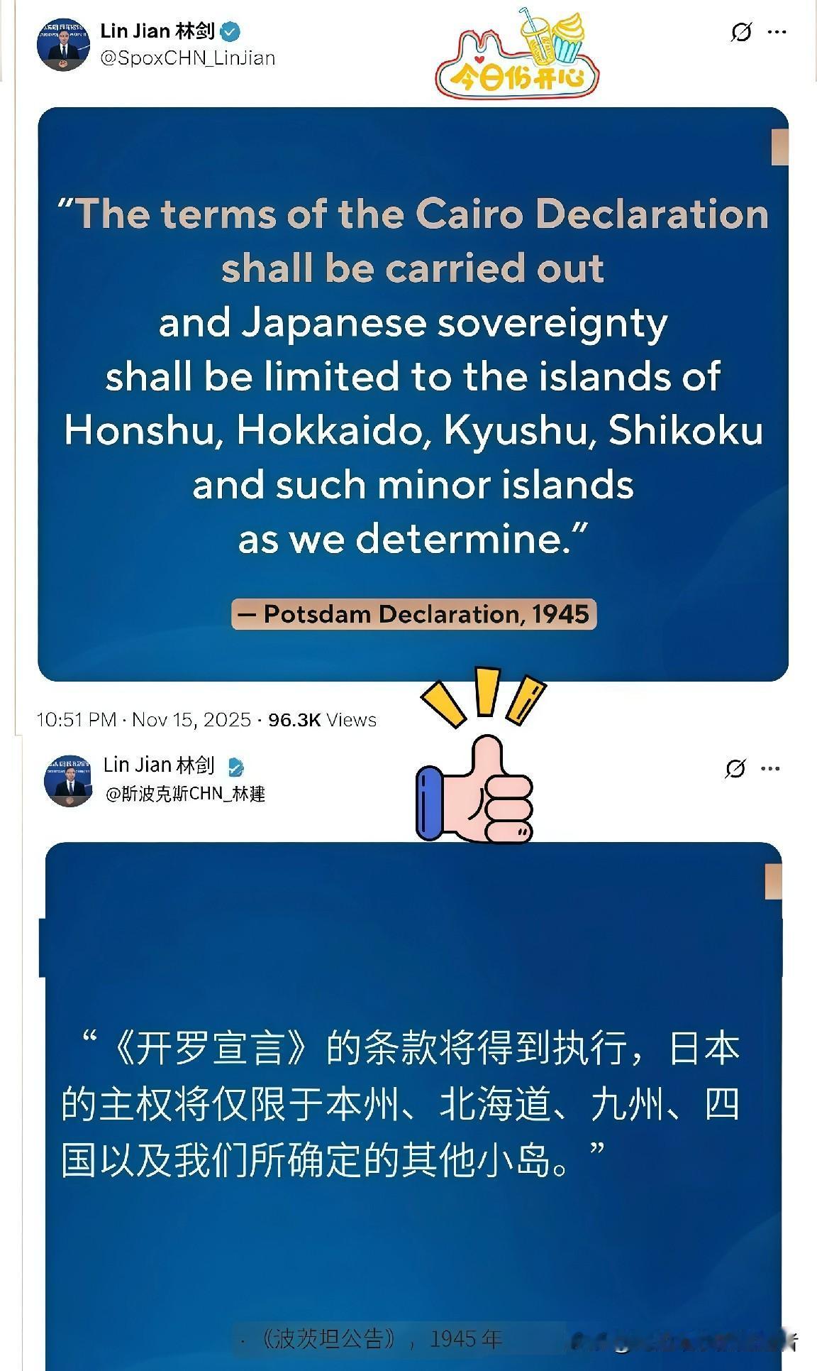 听到这个消息 真的是大快人心 中国正式对日本的领土提出质疑 今天,中国外交部发言人林剑在海外社交媒体平台重磅发声,明确界定“日本之主权必将限于本州、北海道、九州、四国及吾人所决定其可以领有之小岛在内”,其余岛屿不在日本领土之内。 这并非中方首次亮明立场,而是对日本政客高市早苗近期抛出“台湾有事即日本有事”等错误言论的直接反击。 《波茨坦公告》作为二战后国际秩序的重要基石,其划定的日本领土范围是国际社会公认的历史共识,中方此次重申原则,正是为了捍卫历史真相、国际法权威,驳斥日本右翼势力的危险挑衅。 网友纷纷点赞力挺:“不守规矩就该被敲打!”“二战成果绝不能被篡改!” 中方始终秉持和平立场,但面对干涉内政、挑战历史底线的行为,必然坚定亮剑。日本若持续漠视历史与国际法,终将自食恶果,后续动态值得持续关注。 中方援引《波茨坦公告》划日本领土红线,是捍卫战后国际秩序与国际法权威的正义之举。 公告明确界定日本合法领土,中方表态针对性回应日本右翼错误言论,既维护自身利益,也震慑破坏地区稳定的势力,为恪守历史共识与国际法树立了典范。 中方此次重磅发声,折射出日本右翼势力抬头对地区和平的威胁。战后秩序是无数生命换来的底线,日本需正视历史与国际法,停止干涉他国内政。 这也警示,维护和平需主动亮剑,唯有坚定捍卫历史成果,才能遏制冒险挑衅行为。 中方这次直接援引《波茨坦公告》划红线,真的太提气了!日本政客老说些干涉内政的糊涂话,就该这么明确怼回去。公告里写得明明白白,日本合法领土就那四个岛,这是二战定下来的规矩,凭啥随便乱搞? 咱不是要挑事,就是要守住历史底线,捍卫战后秩序。对付这种不守规矩的,就得态度鲜明,让他们知道别瞎蹦跶,不然没好果子吃。支持中方这种“不惹事但绝不怕事”的硬气做法! 各位读者怎么看呢?欢迎评论区留言讨论一下!