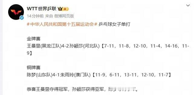,孙颖莎获得亚军,陈梦夺得季军。 乒乓球女子单打金牌赛王曼昱(黑龙江队)4-2孙颖莎(河北队)【7-11,11-8,12-10,11-4,14-16,11-9】 铜牌赛陈梦(山东队)4-1朱雨玲(澳门队)【11-9,6-11,13-11,12-10,11-7】恭喜王曼昱夺得冠军,孙颖莎获得亚军,陈梦夺得季军。