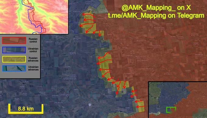 乌军望风而逃,胡利艾波列包围圈快速形成! 乌克兰军队继续沿胡利艾波列-扎波罗热轴线被挤压,随着丹尼利夫卡的陷落,连接胡利亚伊波列市北部的T0401公路被切断。乌军在胡利亚伊波列方向上岌岌可危,另一条补给线也几乎在俄军的火力覆盖之下。如此危急的情况下,俄军在宽达 50 公里的战线上发动了大规模进攻,整体平推,乌军望风而逃!在北部,俄军在此前进攻该村庄的尝试失败后,现在已经完全控制了丹尼利夫卡,切断了红军城至胡利亚伊波列的道路。与此同时,俄军继续向西推进,穿过丹尼利夫卡南部战术高地的树林,占领了多处树林地带的阵地,并开始向西南方向的拉迪斯内方向发起进攻。其余部队则向南推进,穿过兹拉霍达西部和西北部的树林,也在那里占领了新的阵地。在南部,俄军在攻占索洛德克并进入里夫诺皮利亚后,继续保持攻势,在索洛德克西南部的战术高地树林地带推进了超过3.3公里。俄军从索洛德克直接向西推进,并穿过里夫诺皮利亚西北部的树林地带的其他部队协同作战。与此同时,经过大约两天的战斗,俄军114 旅攻占了里夫诺皮利亚和亚布卢科夫,并开始继续向西推进,越过这两个定居点,在胡利亚伊波列后方夺取了树林地带阵地。在西南方向,俄军攻占亚布卢科夫后,开始沿着战术高地向扎特什什亚村发起一系列进攻,推进了约3公里,绕过了韦塞莱西侧,逼近扎特什什亚东郊。其他部队则在这一新的矛头和韦塞莱以北的阵地之间构筑了战线。在南部,俄军巩固了韦塞莱东北部的阵地,抵达该村东北郊,并夺取了胡利亚伊波列-马利尼夫卡公路以北的树林地带。同时,俄军还拉平维索克以东的前线,夺取了八条不同的林线地带阵地。现在俄军进展太快,胡利艾波列的包围圈正在迅速形成。如果乌军不立即做出反应,困守该镇的部队将无法逃脱,胡利艾波列很快将成为下一个红军城。