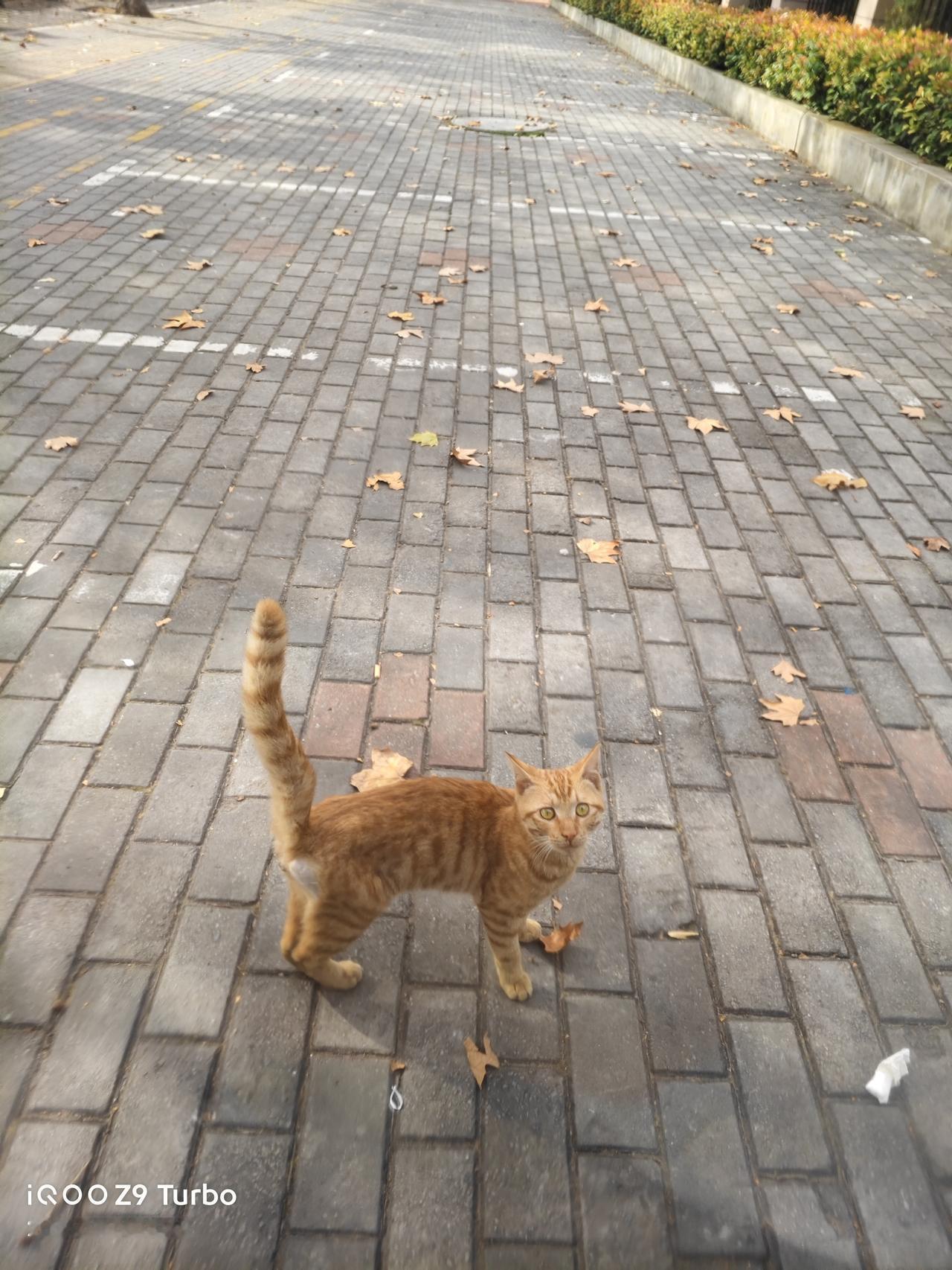 在铺满砖石的小路上,一只橘猫突然闯入视线。它尾巴高高翘着,黄澄澄的眼睛直勾勾盯着我,像在好奇“这人要干嘛”。周围散落着枯叶,衬得它橘色的毛格外鲜亮。这小家伙一点不怕生,就这么大大咧咧站在那儿,活脱脱一副“这片地盘我罩着”的架势,可爱到让人忍不住想凑过去撸两把。