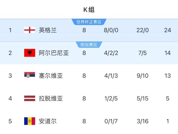 世预赛欧洲区小组赛,英格兰8轮比赛全部结束,他们狂轰22球0失球锁定K组第一,全胜收官!据数据统计,英格兰是历史第一支预选赛0失球且参加至少6轮比赛,最终全胜收官的球队!同时,他们也是最早冲出欧洲的一支球队,提前2轮就已锁定世界杯名额!